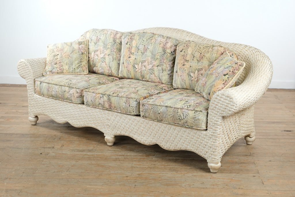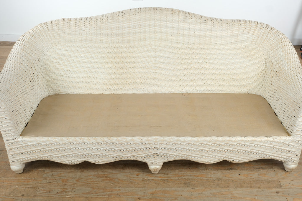 Fully woven off-white wicker frame with rolled arms and scalloped apron