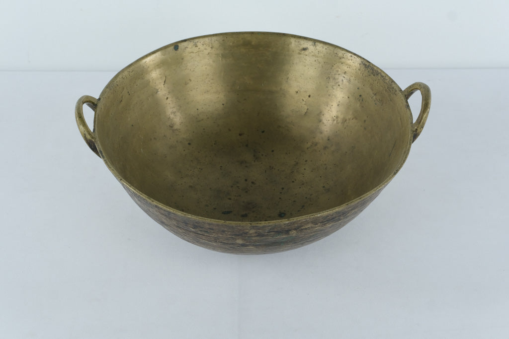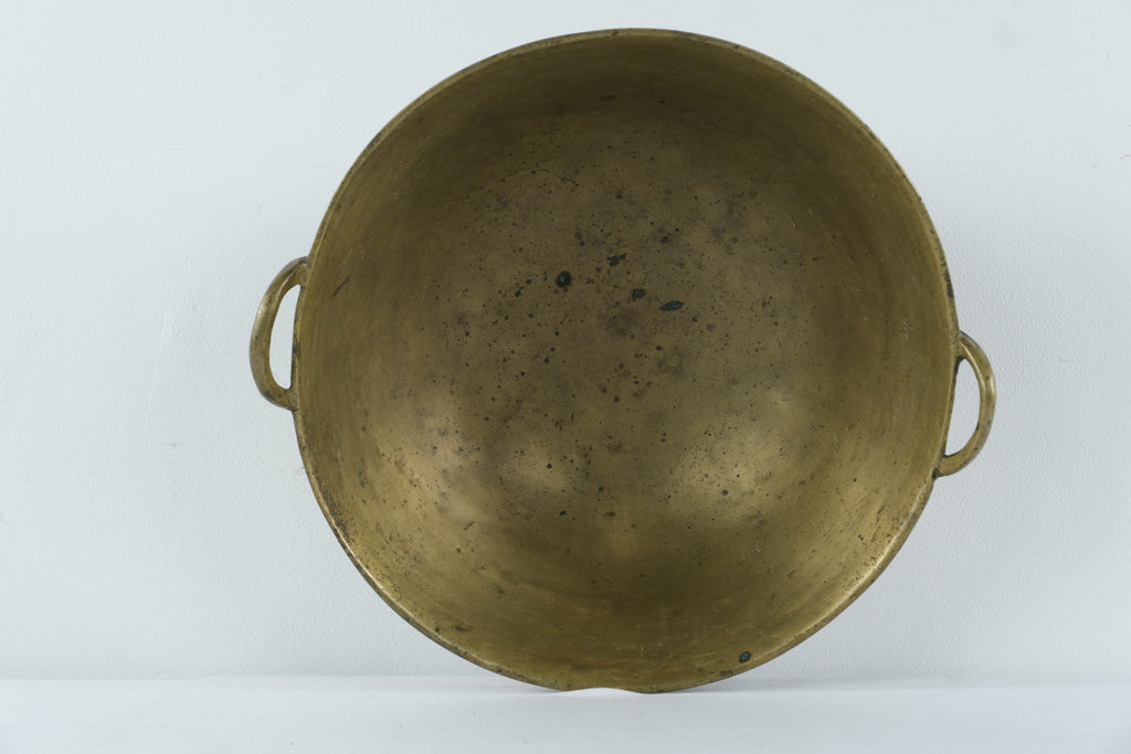 This beautifully aged brass bowl is a classic example of traditional European metalwork, likely crafted in the 18th or 19th century for everyday household use. Hand-hammered and gracefully formed, it features a deep rounded body and sturdy twin ring handles, combining functionality with understated elegance.
