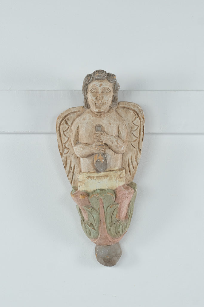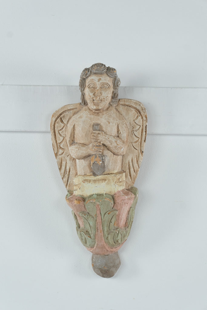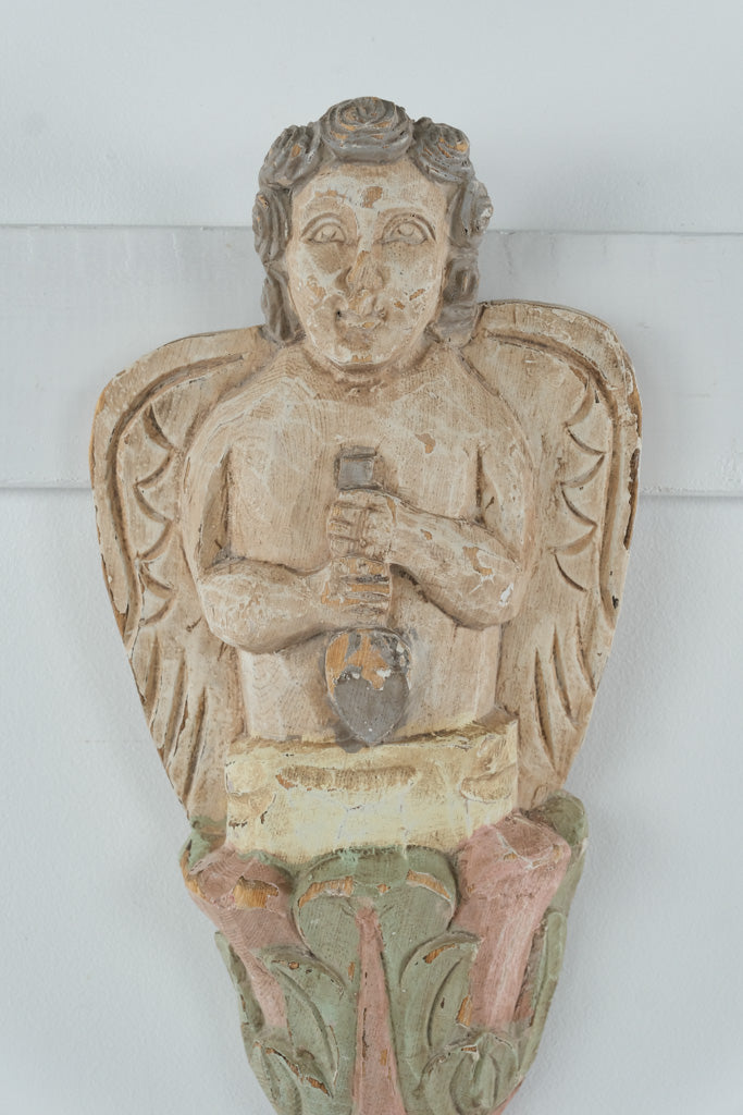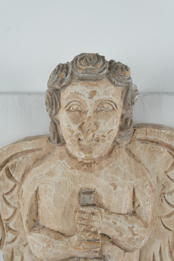 This beautifully aged hand-carved wooden angel wall sconce features a serene cherub figure with softly carved wings and gently worn polychrome paint. The angel holds a central vertical element, likely intended to support a candle, small devotional object, or decorative accent, while resting above a sculpted floral and scroll-form base.
