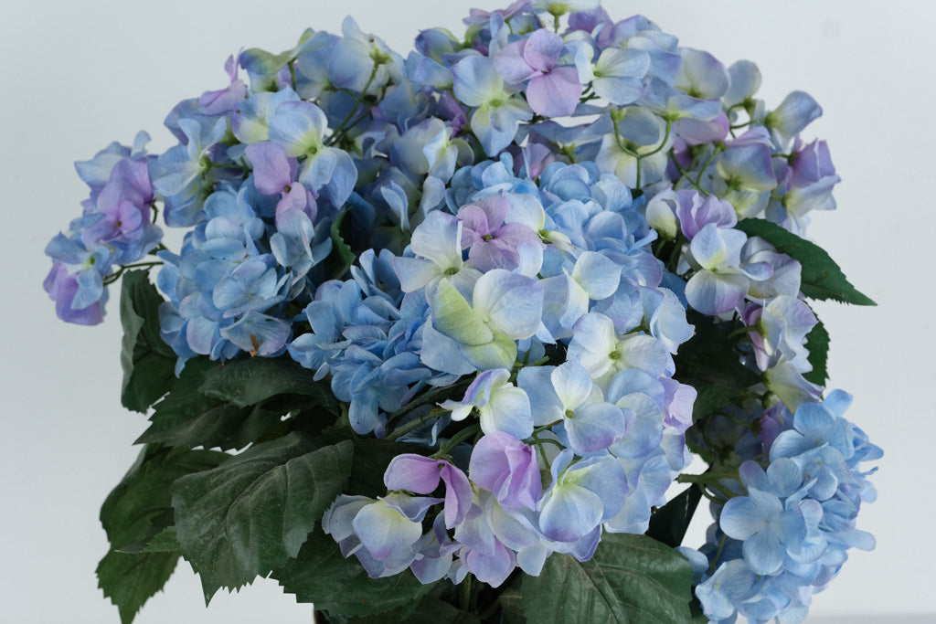 • Realistic faux hydrangea blooms in blue and lavender tones