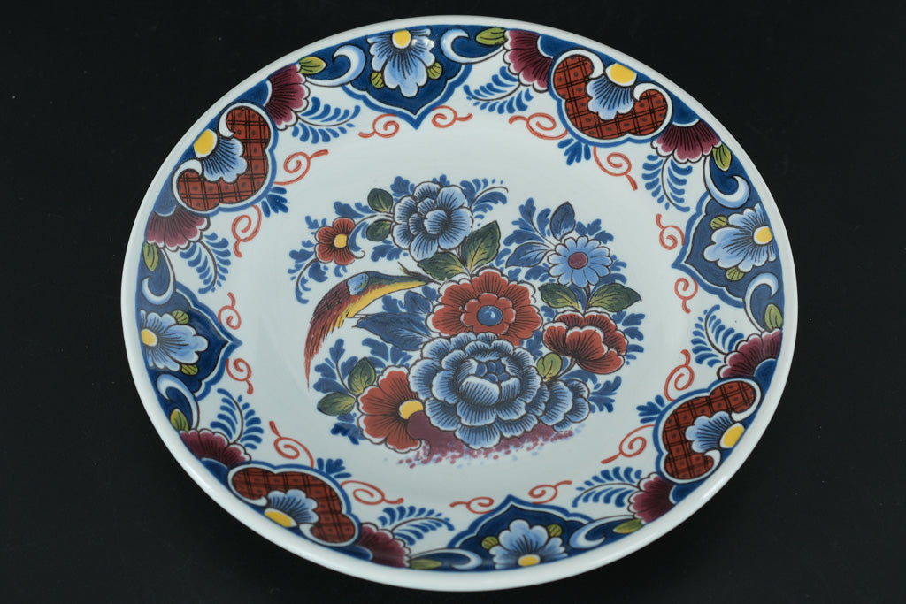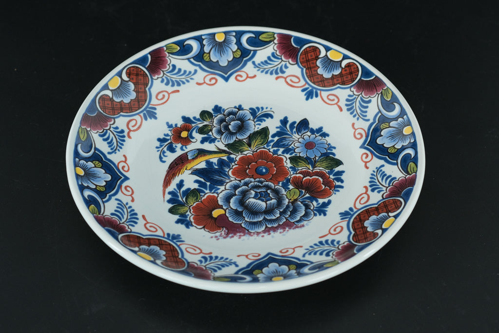 This vibrant 7.5-inch Dutch decorative plate showcases a beautifully hand-painted Delft-style design featuring a colorful songbird nestled among richly detailed florals. Bold blues, deep reds, and warm golden yellows create a striking palette, framed by an ornate border that highlights classic Dutch folk-art influences.