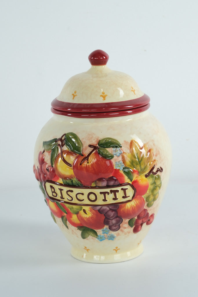 Bring a warm touch of Italian-inspired charm to your kitchen with this beautifully hand-painted ceramic biscotti jar, created for Nonni’s and crafted in China. Featuring a raised, colorful fruit motif—apples, grapes, pears, and delicate flowers—this jar is both decorative and functional. The glossy, textured artwork wraps fully around the jar, and the matching domed lid has a snug fit and coordinating painted details.