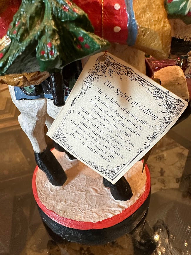 Rich in storybook charm and old-world Christmas tradition, this House of Hatten St. Nicholas figurine beautifully depicts Santa riding a spirited horse, carrying gifts and symbols of generosity. Part of The Spirit of Giving holiday collection, the piece draws inspiration from European St. Nicholas folklore and the origins of Santa Claus as a giver to those in need.