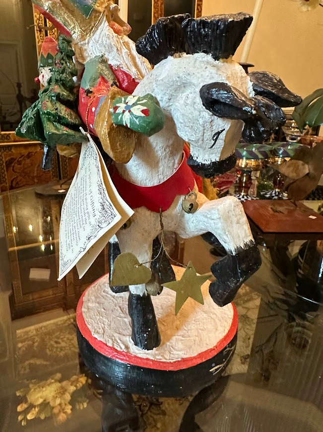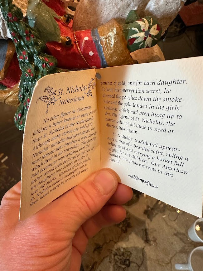Handcrafted with expressive detail, the figurine features layered textures, muted folk-art colors, and charming accents—including a hanging star, bells, evergreen tree, and a printed story tag explaining the legend of St. Nicholas. Measuring approximately 12.75 inches tall, with a 9-inch width and 6.5-inch depth, it makes a striking centerpiece for a mantel, entry table, or holiday display.