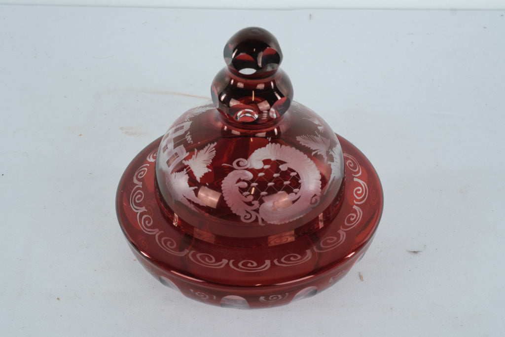 This elegant vintage ruby red glass covered bowl features intricate etched decoration throughout, including scrolling motifs, oval panels, and figural imagery beneath the lid. The rich cranberry-red glass glows beautifully when light passes through, highlighting the layered patterns and classic European-inspired craftsmanship.