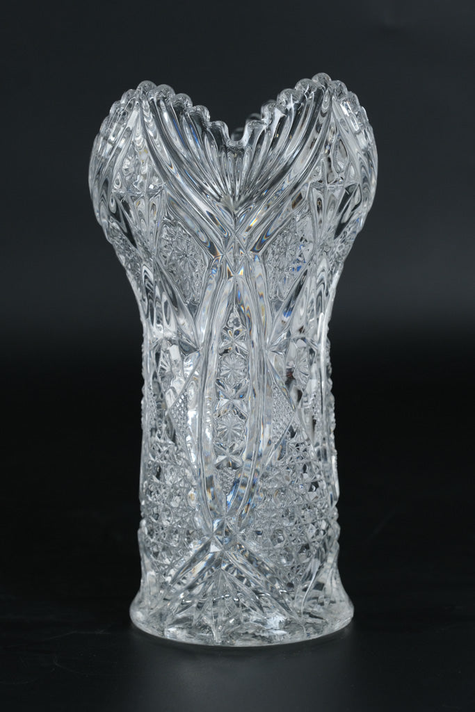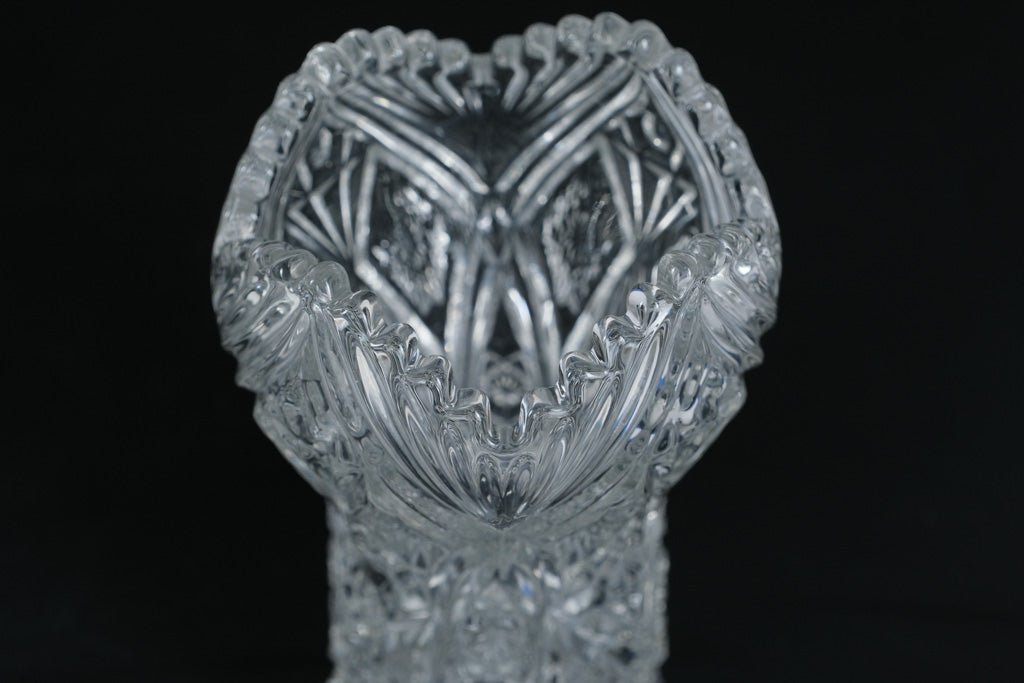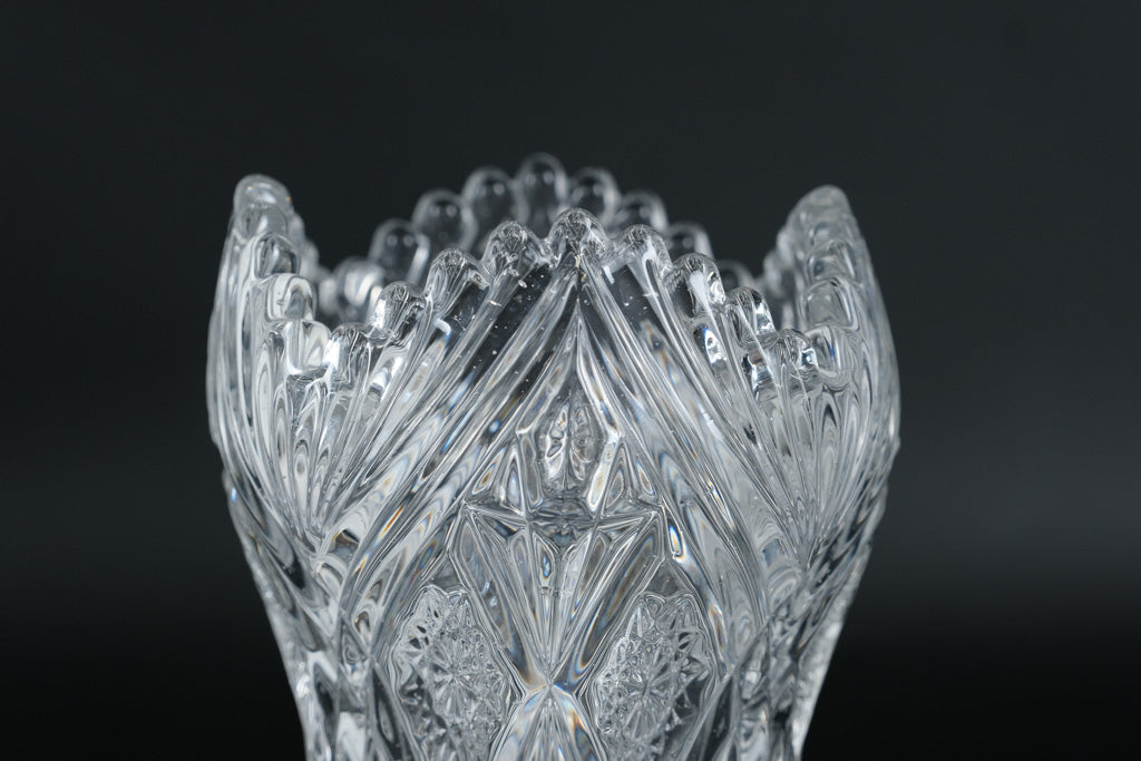This elegant set of two matching cut crystal vases showcases classic brilliance and refined symmetry. Each vase measures approximately 4 inches round and 8 inches tall, featuring a beautifully flared silhouette with a softly scalloped rim. The bodies are richly detailed with starburst panels, diamond textures, and sweeping vertical cuts that catch and reflect light from every angle. Their timeless design makes them perfect for floral arrangements, mantel display, or as striking standalone decorative accents. Displayed together or separately, these vases bring traditional crystal craftsmanship and visual impact to any space.