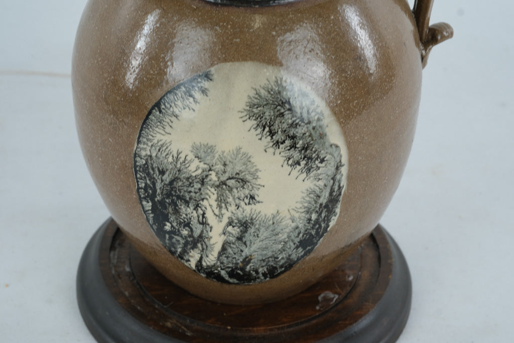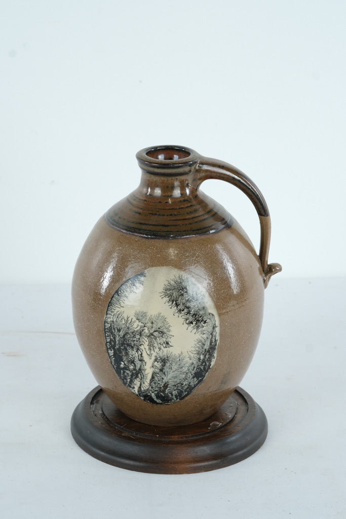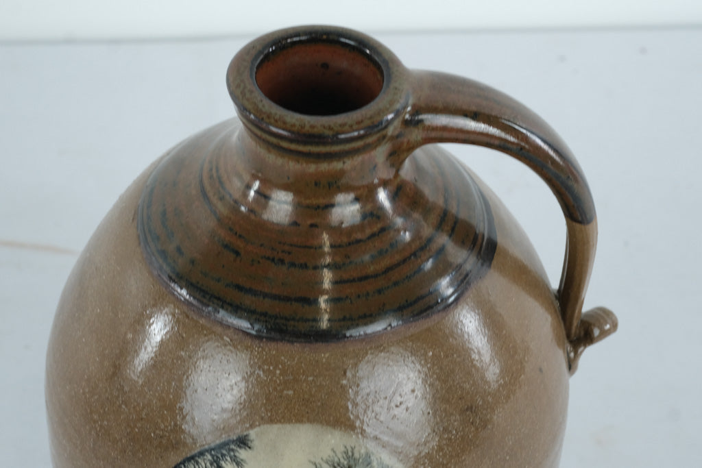 This beautifully crafted studio pottery jug showcases the warmth and character of handmade stoneware. Finished in rich earthy brown glaze, the rounded form is accented by a striking circular tree motif rendered in deep black against a cream ground, evoking a serene, nature-inspired scene. The jug features a gracefully pulled handle and a narrow spout, giving it both sculptural presence and traditional charm.