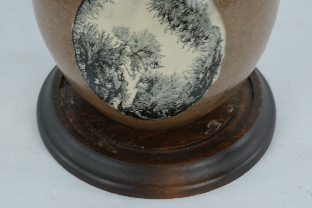 The piece sits on a fitted wooden display base, enhancing its visual impact and making it ideal as a decorative accent for shelves, mantels, or tabletops. Signed on the underside by the artist, though the signature is partially illegible, this jug carries the unmistakable individuality of studio craftsmanship.
