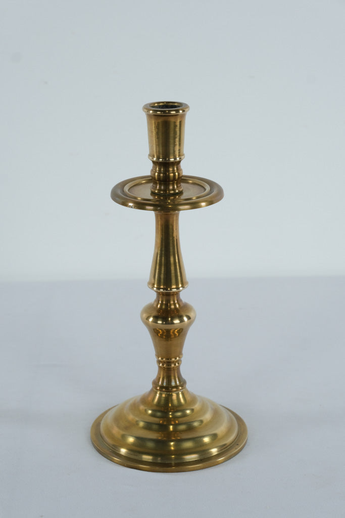 Measuring approximately 10.5 inches tall with a 4.5-inch round base, this candlestick offers both elegance and stability. The smooth, polished brass surface reflects light beautifully, while subtle patina adds character and depth that collectors appreciate.