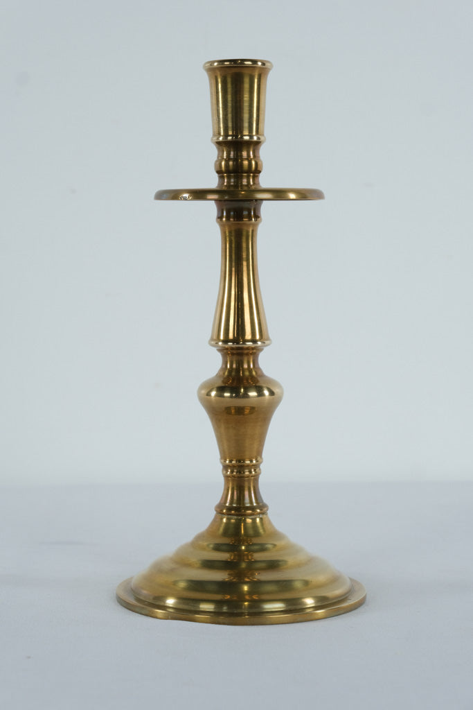 This handsome vintage solid brass candlestick features a beautifully balanced, traditional form with a gently flared cup, turned central column, and a substantial stepped round base. Its taller profile and warm brass glow give it a stately presence, making it an excellent accent for mantels, sideboards, dining tables, or traditional interiors.