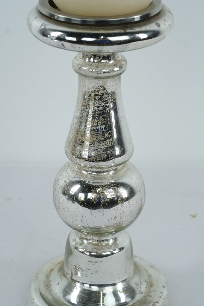 Add timeless elegance and a touch of vintage charm to your home décor with this tall silver candlestick holder, complete with a battery-operated LED candle. Crafted from a porcelain-like material with a silver mercury glass effect, this piece reflects light beautifully while offering the look of aged patina for added character.