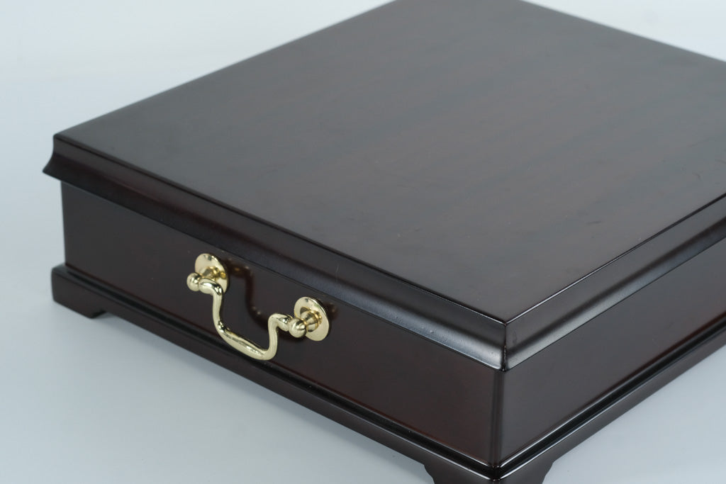 This beautifully crafted Bombay Company tea chest brings classic elegance to any kitchen, dining room, or tea-serving space. Made in 1994 and finished in a deep mahogany stain, it features rich wood grain, gleaming brass-tone handles, and a smooth hinged lid. Inside, a plush green felt interior hosts 12 individual compartments, perfect for organizing a variety of tea bags or repurposing the chest as a refined storage box for keepsakes, jewelry, or collectibles.