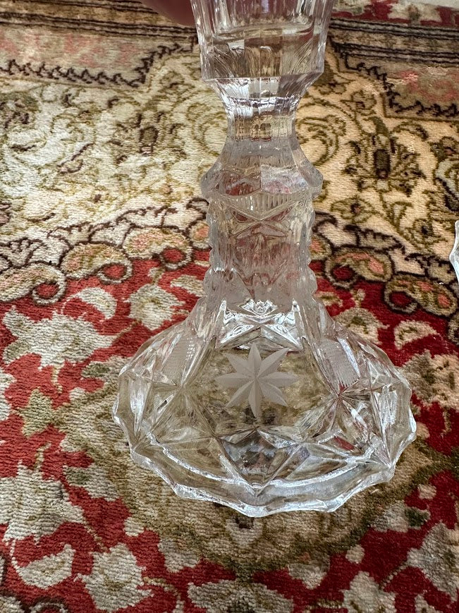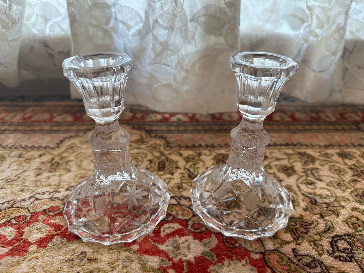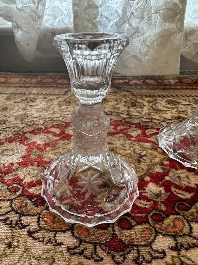 This beautiful pair of Wara lead crystal candlestick holders exemplifies the elegance and clarity that made German crystal world-renowned. Crafted with precision and artistry, each 5-inch holder features hand-cut star and crosshatch etching, crisp faceted detailing, and a scalloped 3.5-inch base that sparkles brilliantly in any light.