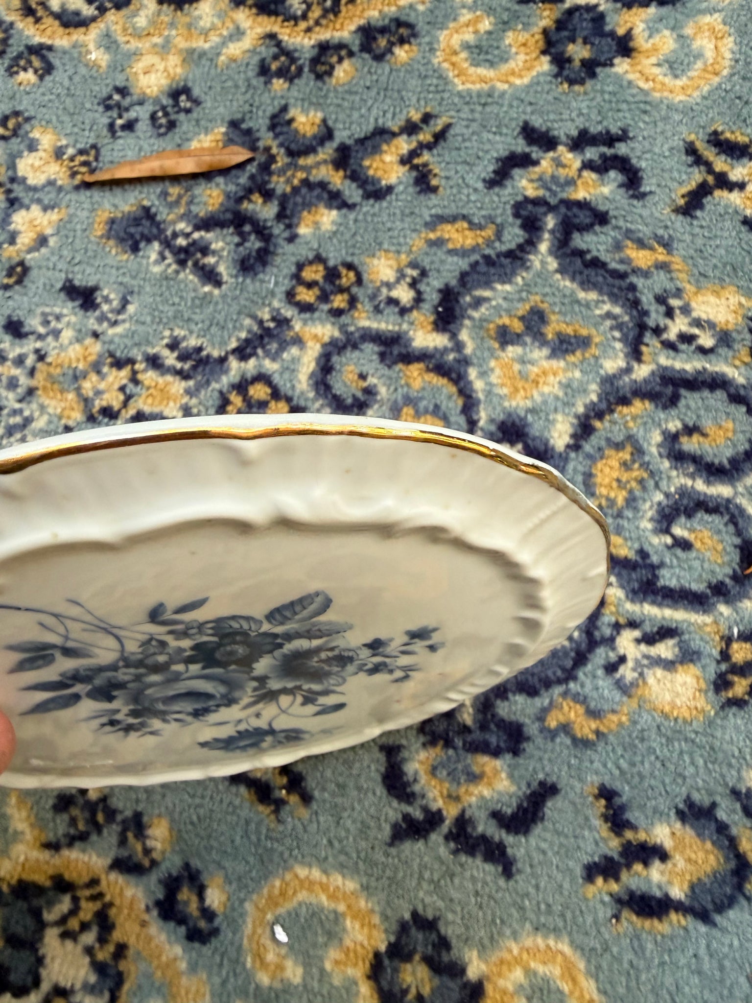 Light wear to the gold rim and minor glaze marks consistent with age. No major chips or cracks observed. Retains a bright glaze and crisp blue transfer decoration.