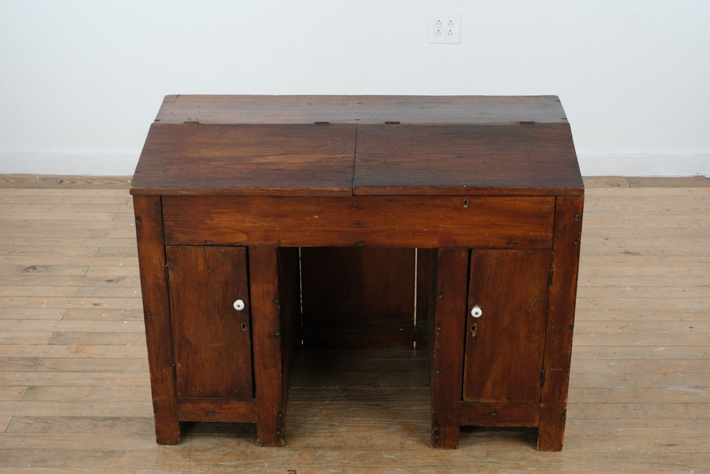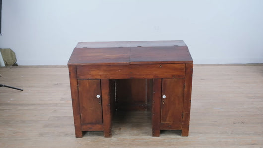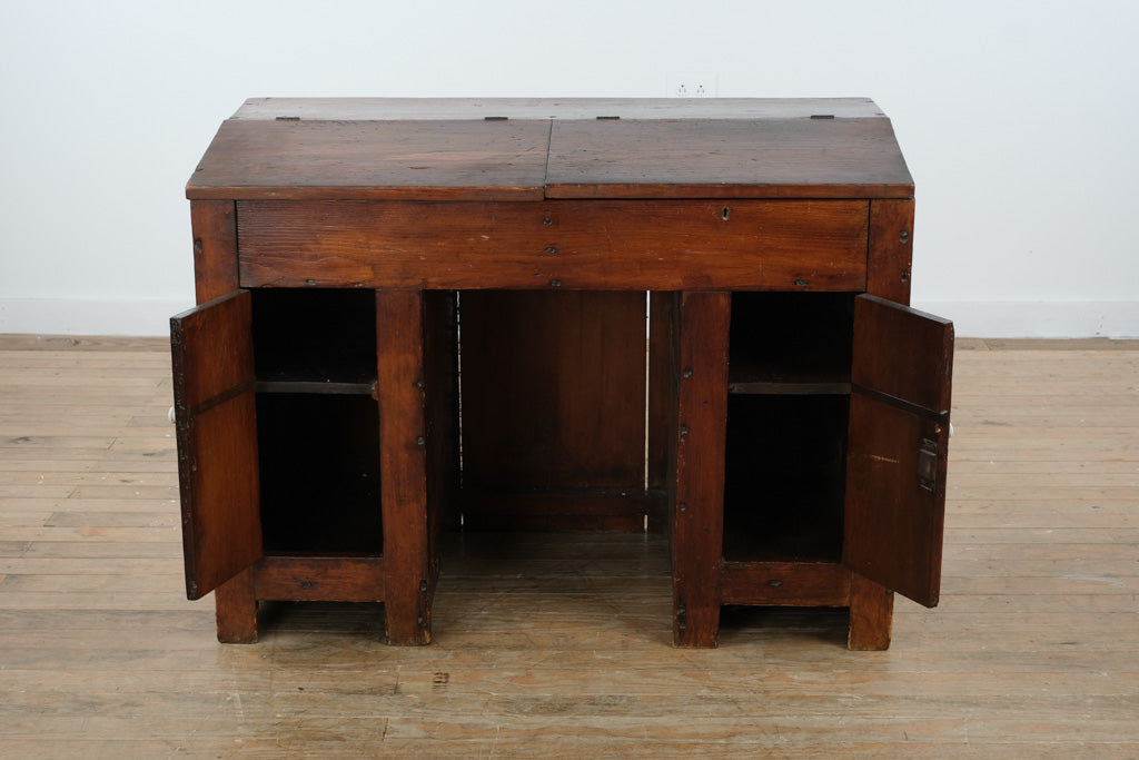 This charming antique worktable or washstand cabinet captures the honest beauty of early handcrafted furniture. Built from solid wood with visible joinery and a rich aged patina, it showcases the character and practicality of 19th-century design. The top features a hinged lift-up compartment for concealed storage, while the lower section offers two paneled cabinet doors opening to additional space.