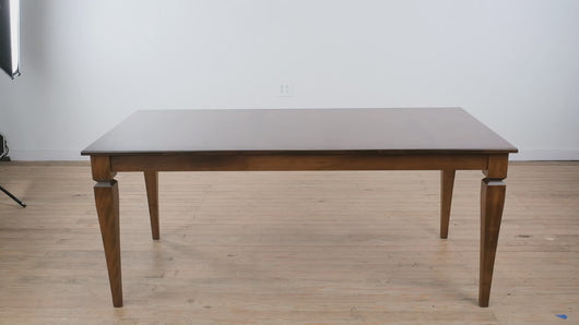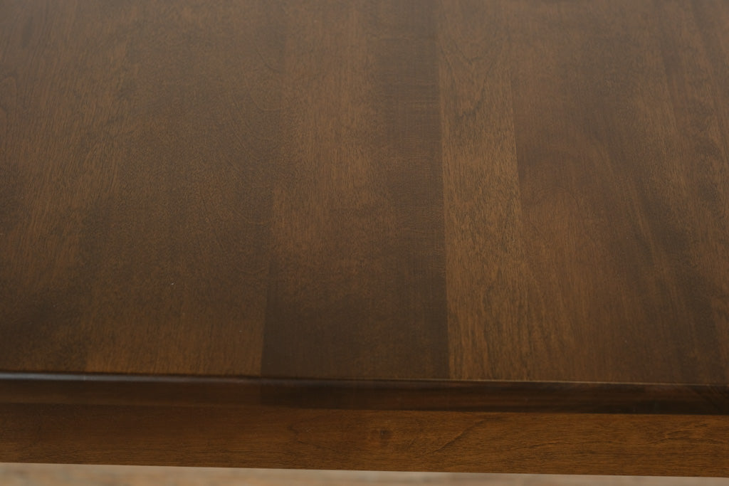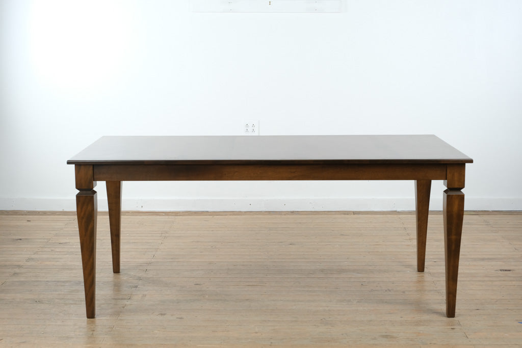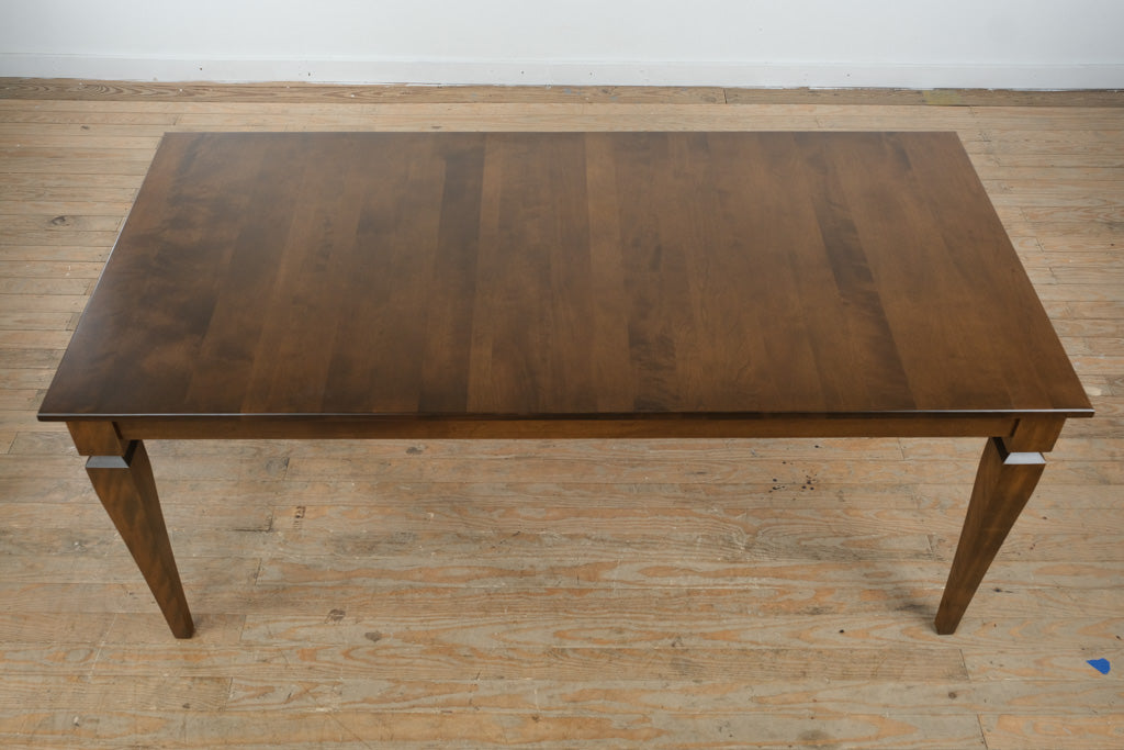 Expertly crafted from solid wood, this table features a smooth rectangular top with rich, natural grain variation and a subtly finished edge. The tapered legs are thoughtfully shaped with understated detailing near the apron, providing both visual interest and excellent stability. The overall construction reflects quality craftsmanship designed for daily use.