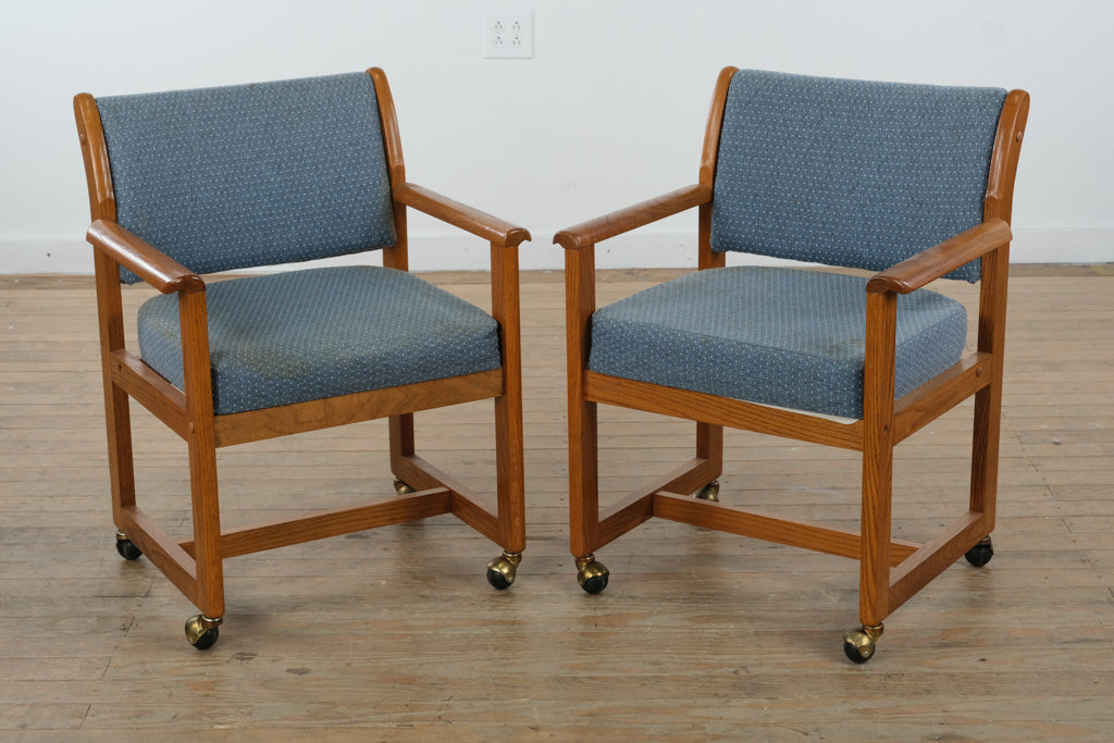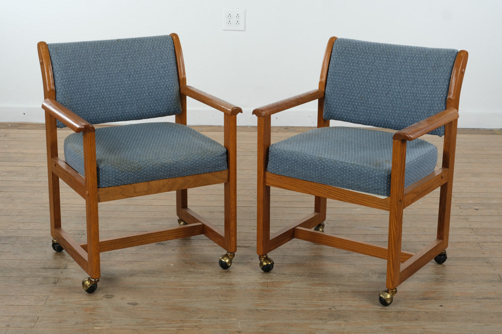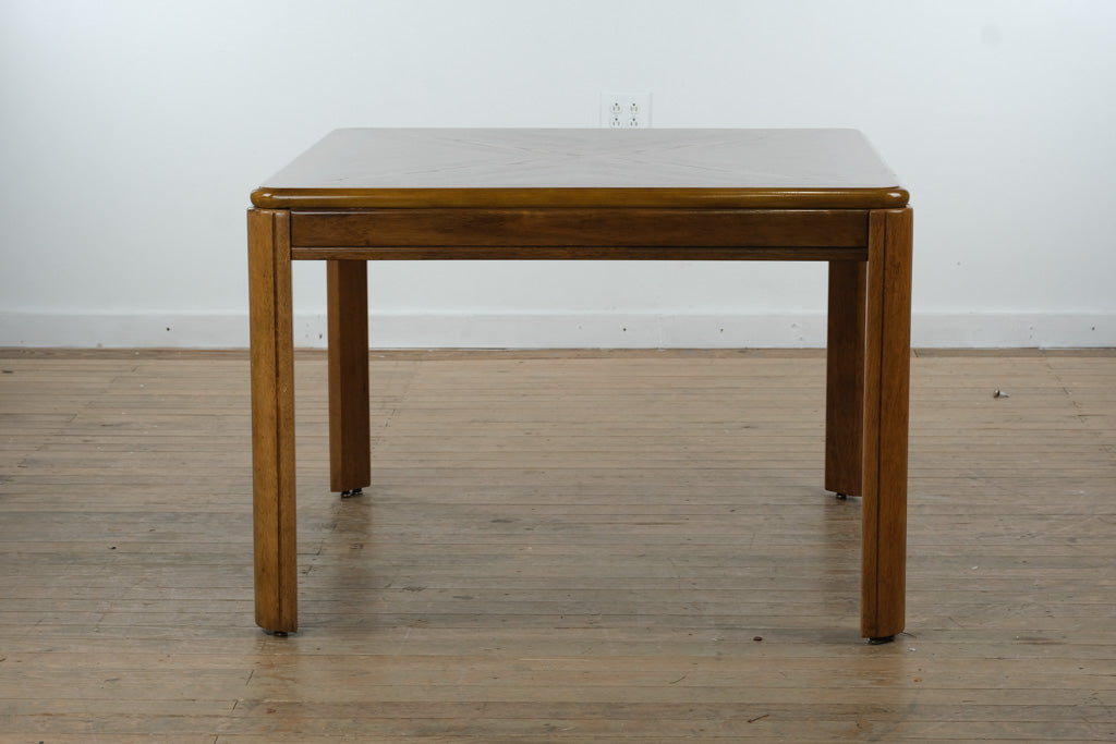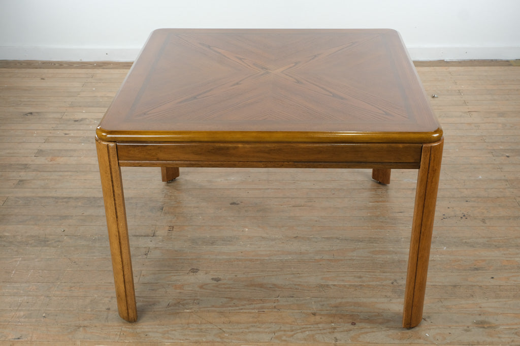 Crafted from solid wood with a warm, rich finish, the table features a striking square top with elegant geometric grain detailing that adds visual depth and character. The accompanying armchairs are equally well-made, with sturdy wood frames, supportive upholstered seats and backs, and brass casters that allow for easy movement while maintaining a polished, traditional look.
