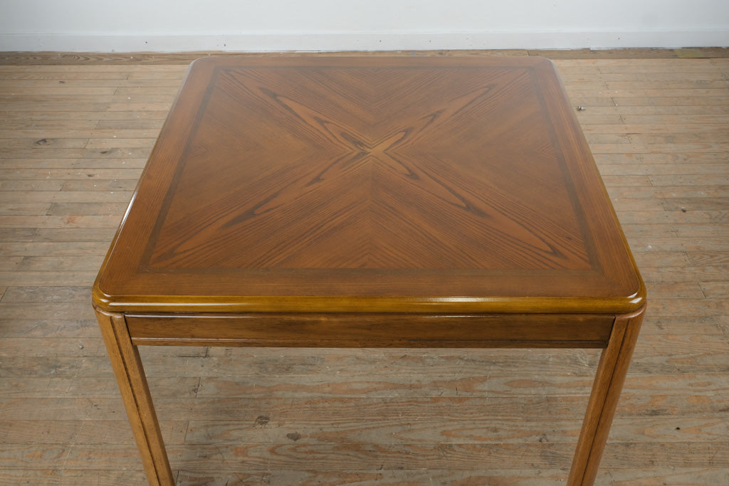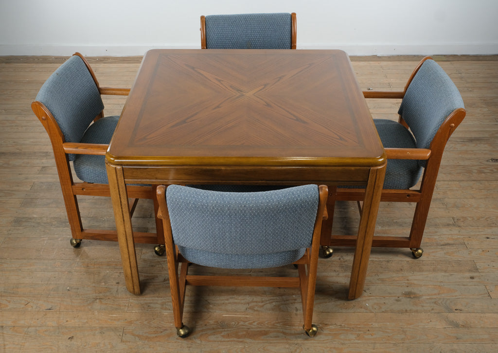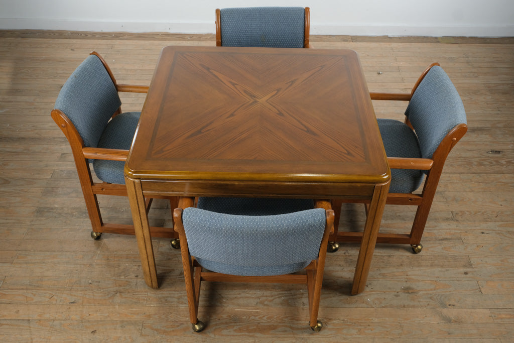 Refined yet highly adaptable, this vintage square wood dining table set offers classic design with everyday versatility, pairing a beautifully grained tabletop with four comfortable rolling armchairs—ideal for dining, entertaining, and relaxed gatherings of all kinds.