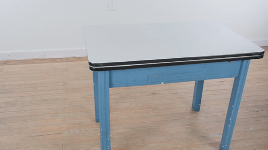 Add a touch of retro charm to your space with this vintage enamel-top table featuring classic pull-out leaves and sturdy painted-blue legs. The white enamel surface gives it a clean, timeless look while the blue base adds character. Perfect as a kitchen table, crafting station, coffee bar, or multifunctional workspace.
