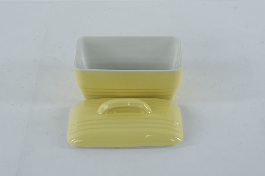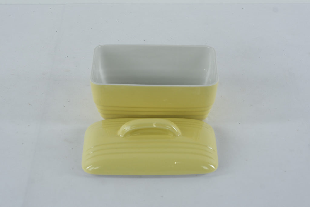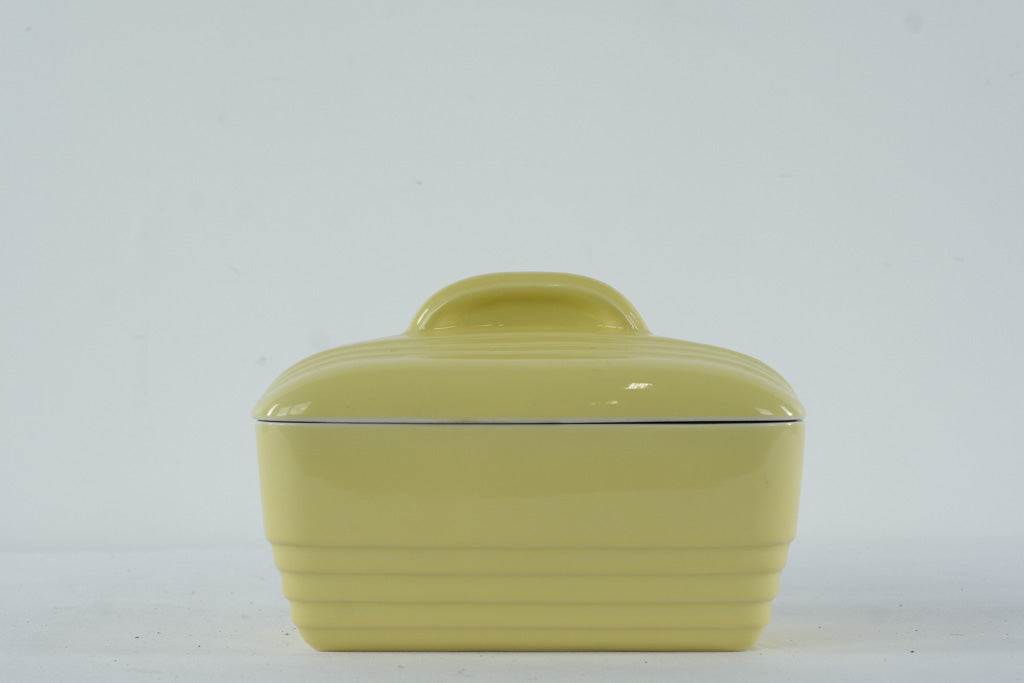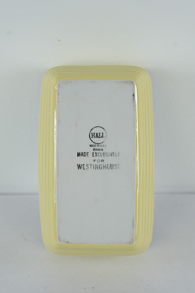 This vintage covered refrigerator dish was produced by Hall China exclusively for Westinghouse, part of a mid-20th-century line of durable, streamlined kitchen and refrigerator ware. Finished in a soft pastel yellow with classic ribbed Art Deco detailing, the design reflects the clean, modern aesthetic popular in American kitchens of the 1930s–1950s.