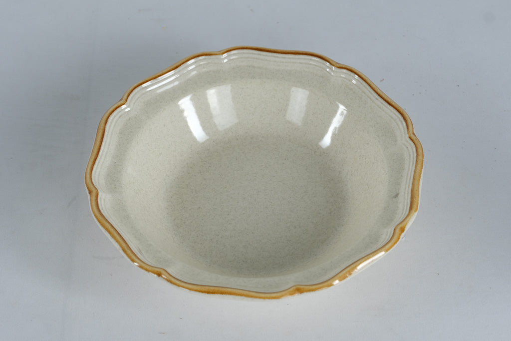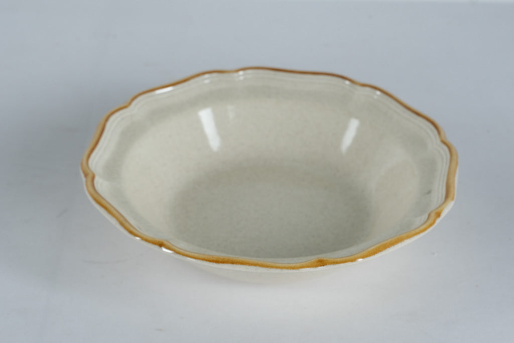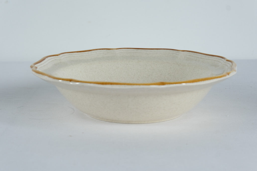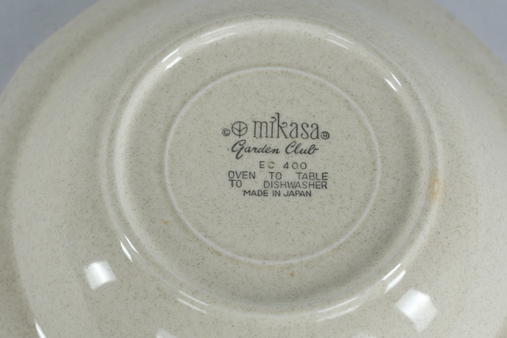 This vintage Mikasa Garden Club serving bowl features the classic speckled cream glaze and softly scalloped rim that defines this beloved pattern. Made in Japan and marked EC 400, the bowl has a warm brown accent along the edge and a gently flared profile that works beautifully for both everyday use and display.