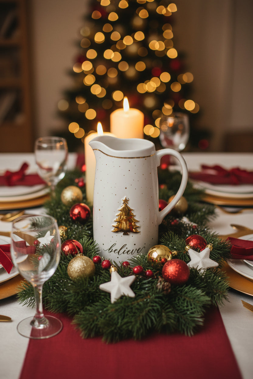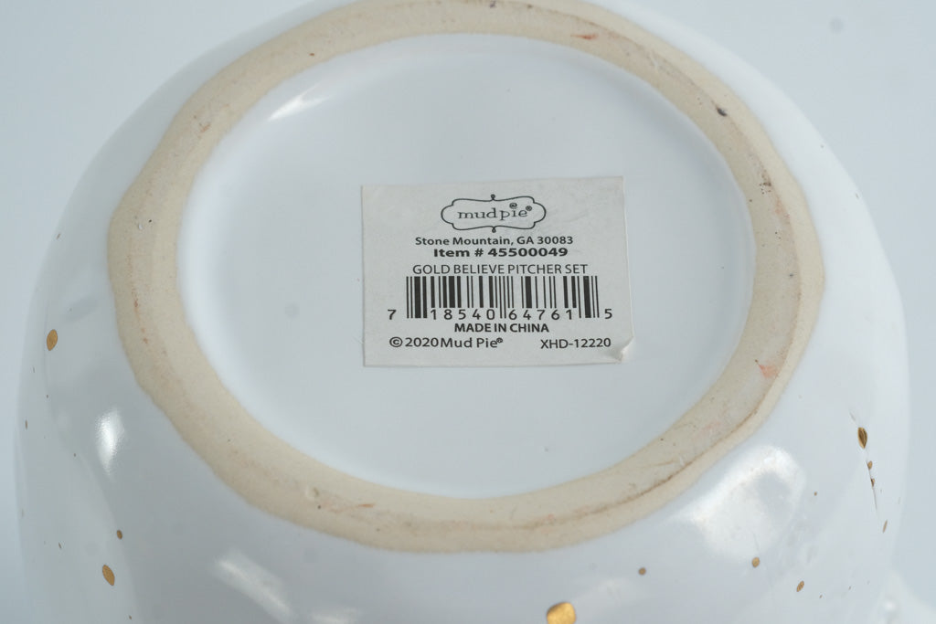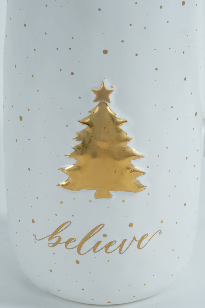 Bring a touch of festive sparkle to your holiday table with this charming Mud Pie “Gold Believe” ceramic pitcher. Designed with a clean winter-white base accented by shimmering gold splatter detailing, the pitcher features a raised metallic gold Christmas tree motif and elegant script that reads “believe.”