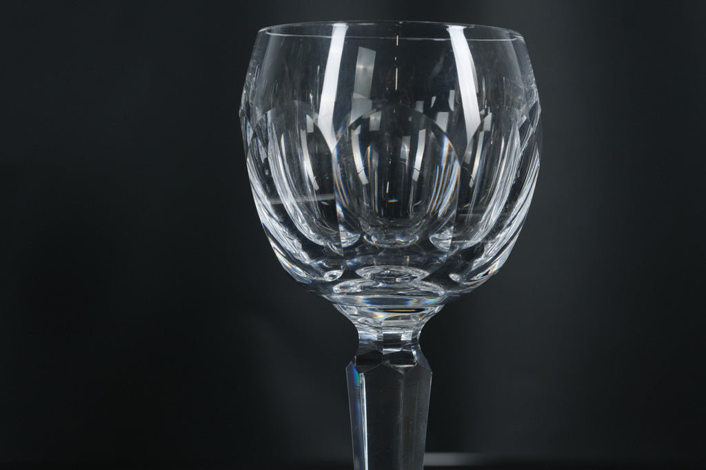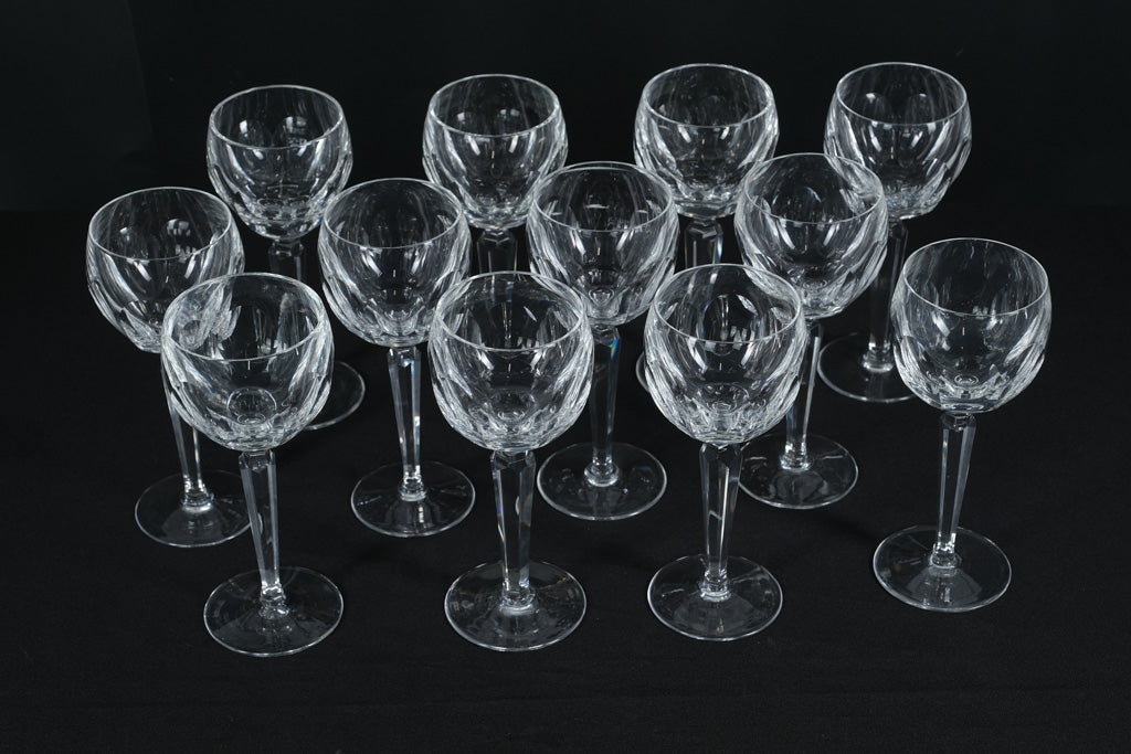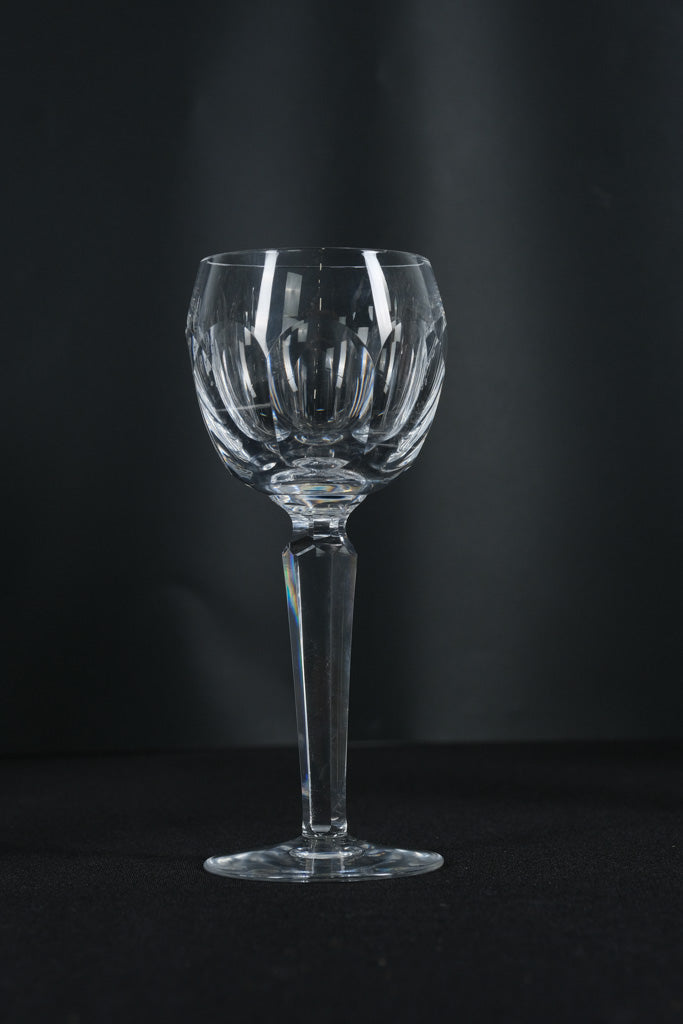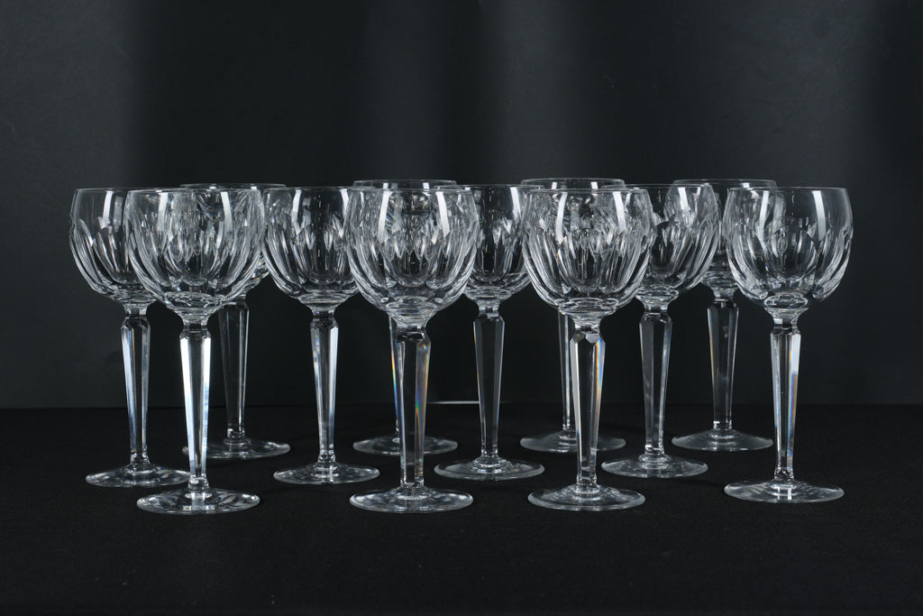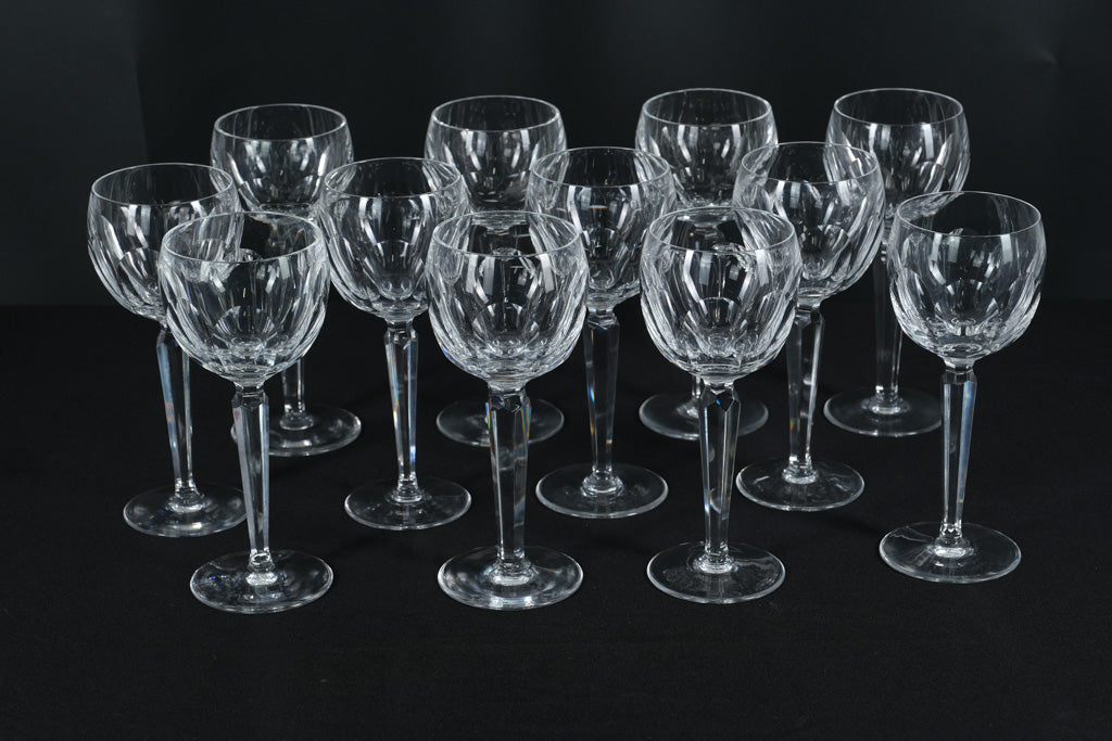 A refined and elegant set of twelve Waterford crystal wine glasses, showcasing the timeless Sheila Claret pattern. Each glass features a beautifully rounded bowl with deep optic-style cuts that catch and reflect light, paired with a slender stem and balanced foot—classic Waterford craftsmanship at its finest.