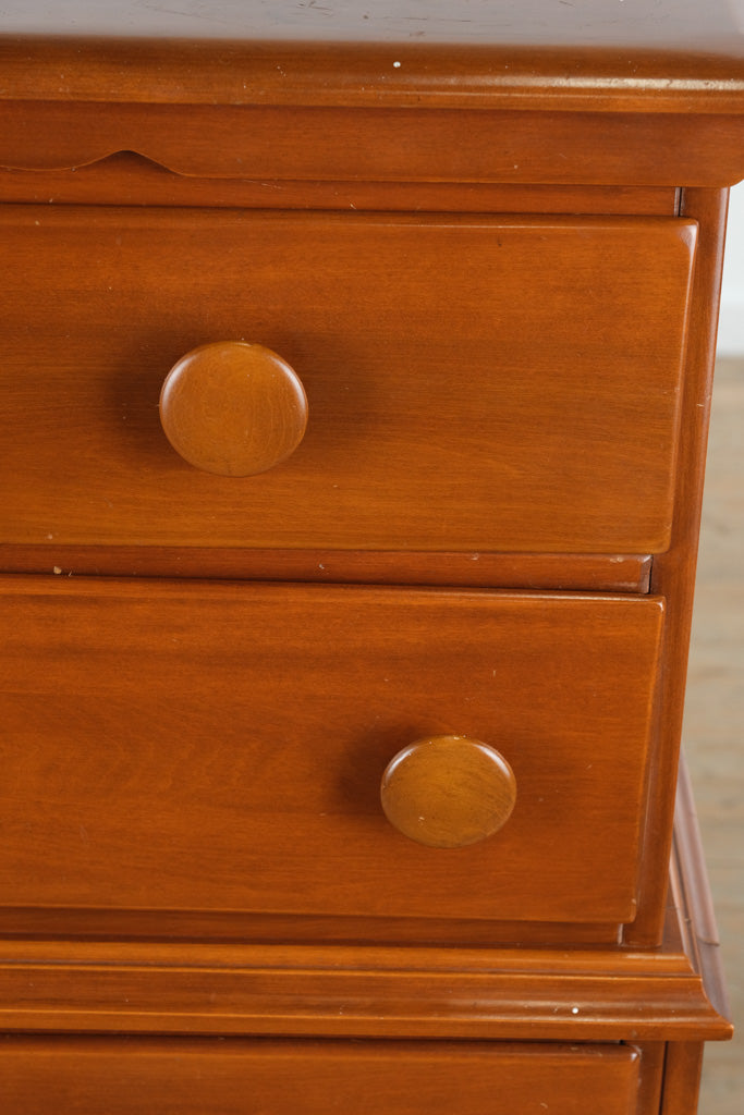 A timeless example of mid-century craftsmanship, this 1950s solid wood chest-on-chest dresser offers enduring quality and functional charm. Constructed from either cherry or maple, it showcases a warm, honey-toned finish and classic simplicity that suits both traditional and transitional interiors.
