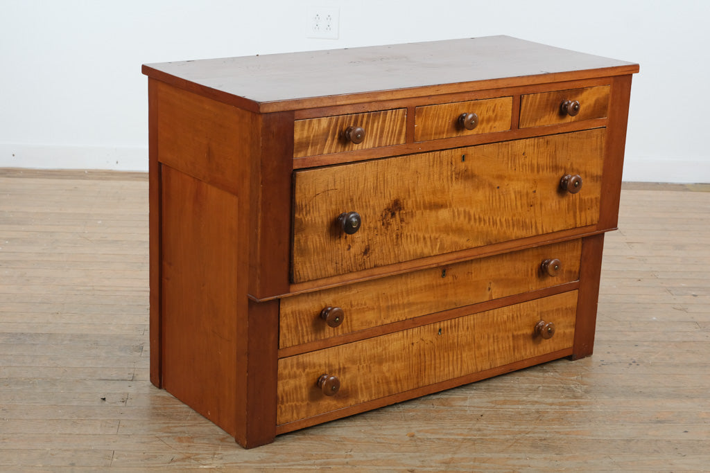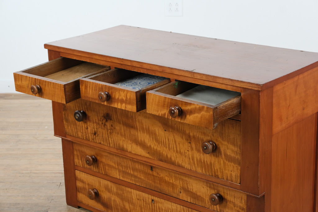 Crafted in the late 1800s, this dresser showcases rare tiger maple on its drawer fronts—known for its striking, undulating grain pattern—and a solid hardwood case in a complementary warm tone. Traditional joinery, turned wooden pulls, and the understated Empire silhouette reflect early American craftsmanship. The back shows intentional holes likely indicating the former presence of a backsplash or mirror, a common feature in dressers of the period.