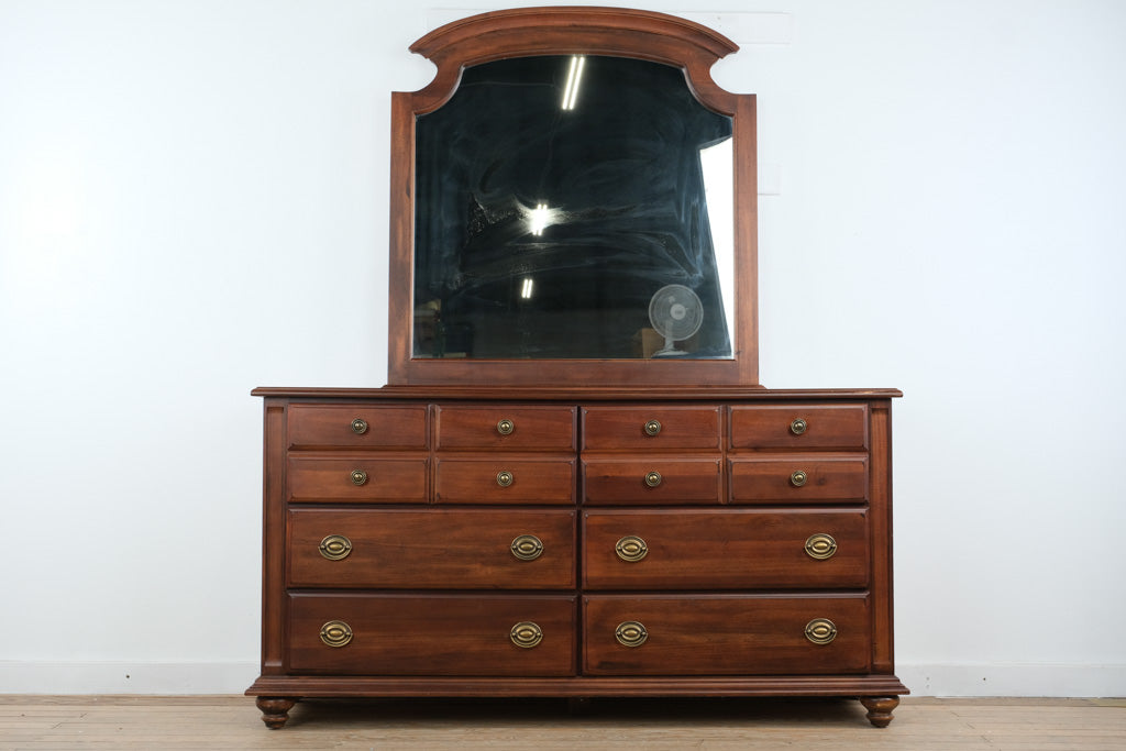 Wide format dresser offering high drawer capacity with integrated mirror for full bedroom functionality. Works as a primary storage piece with balanced scale and straightforward traditional styling.