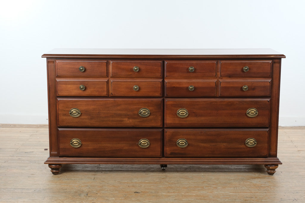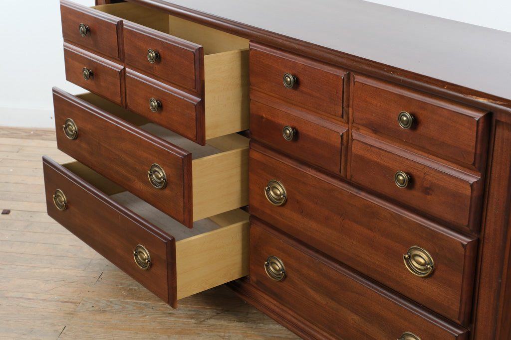 Mahogany triple dresser with mirror in traditional American style featuring nine drawer configuration and framed mirror top. Manufactured by Broyhill, this piece reflects late 20th century production focused on accessible quality construction and balanced proportions. Craze Furniture presents a 66 inch wide dresser with graduated drawer sizing, brass hardware, and integrated mirror for bedroom use. Clean lines, bracket feet, and molded edges support a versatile traditional profile without excessive ornament.