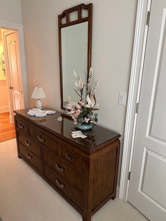An iconic statement of Hollywood Regency glamour and Asian-inspired elegance, this Century Furniture “Chin Hua” dresser by Raymond K. Sobota exemplifies the bold sophistication that made the collection legendary. Rich burl wood veneer, signature brass hardware, and clean architectural lines create a piece that feels both timeless and striking.
