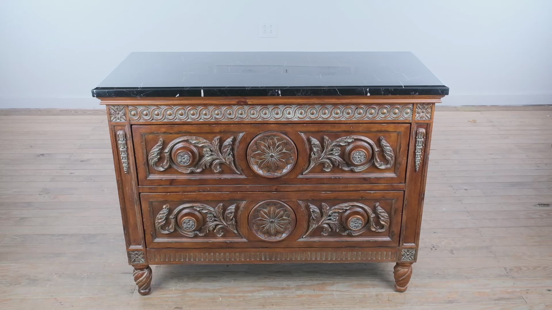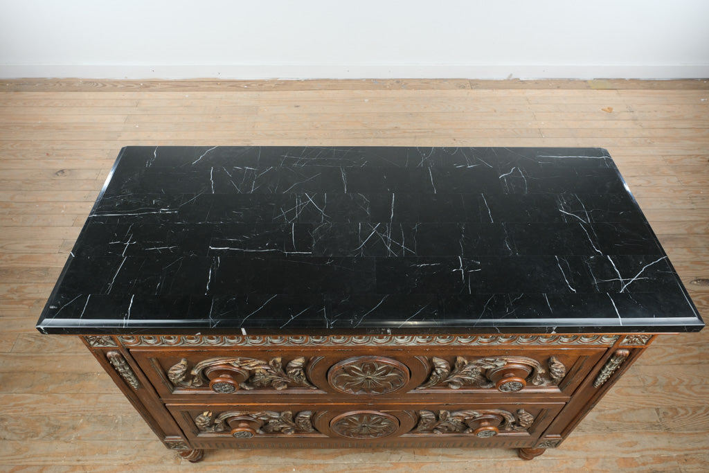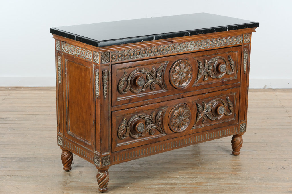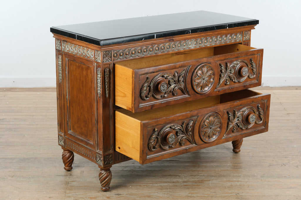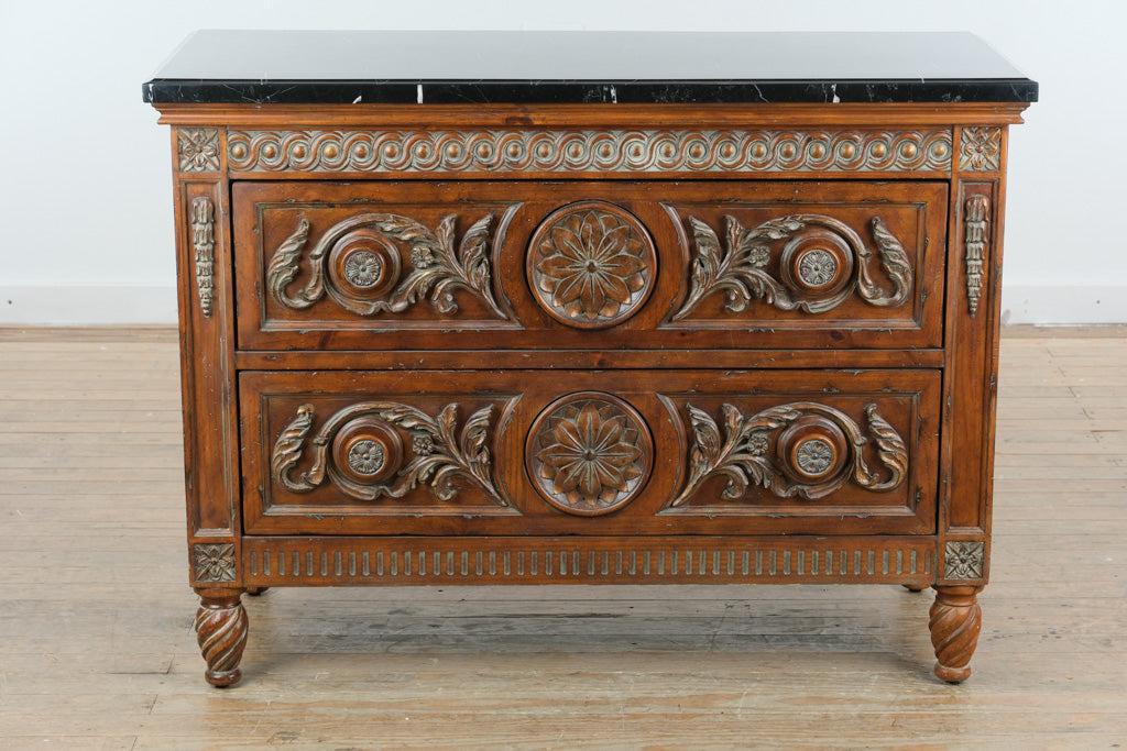 Grounded in classic craftsmanship and understated elegance, this Charlotte Hall two-drawer chest features richly carved wood detailing paired with a sleek black stone top, creating a refined balance of warmth and sophistication. Its substantial scale and timeless design make it a versatile anchor piece for both traditional and transitional interiors.