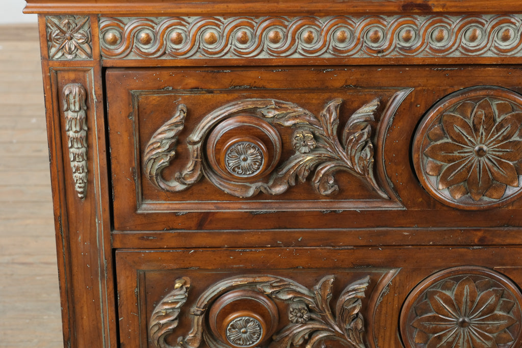Ideal as a chest in a bedroom, a statement piece in an entryway, or refined storage in a living or dining space, this piece offers both visual presence and everyday functionality. Its classic proportions and carved detailing allow it to pair beautifully with traditional furnishings while remaining adaptable to more eclectic settings.