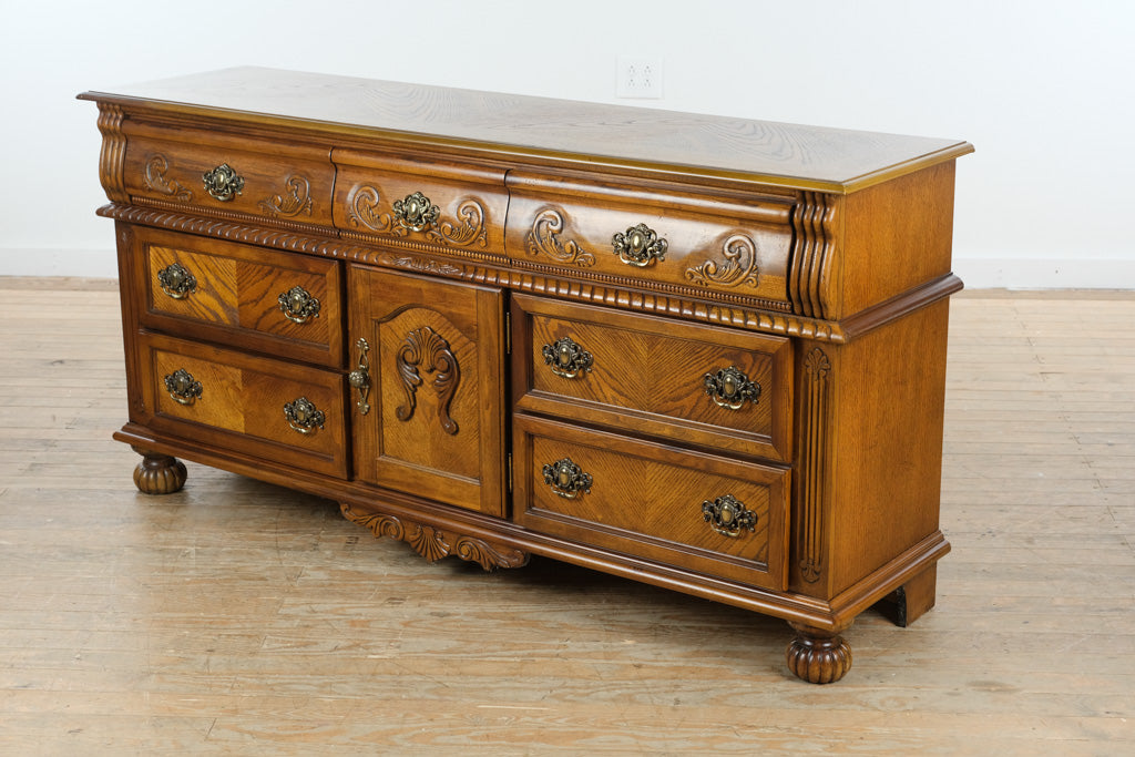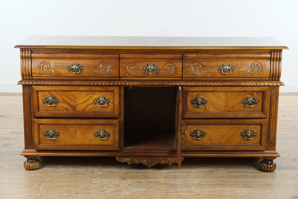 Richly detailed and beautifully preserved, this Oak Wynwood dresser embodies the sophistication of traditional design. Its ornate carvings, intricate drawer pulls, and warm oak grain create a statement piece that brings heritage charm and enduring quality to any refined interior.