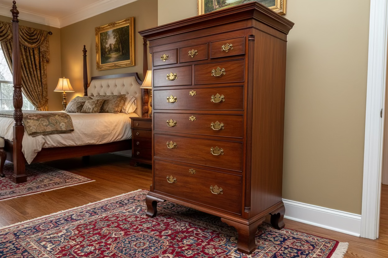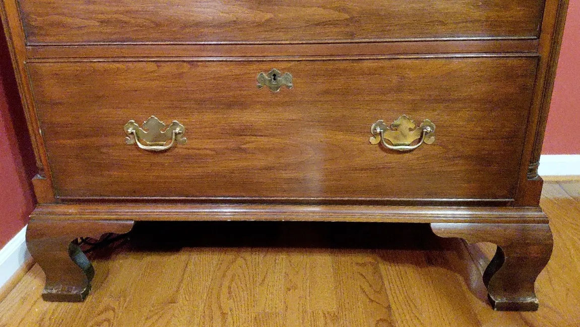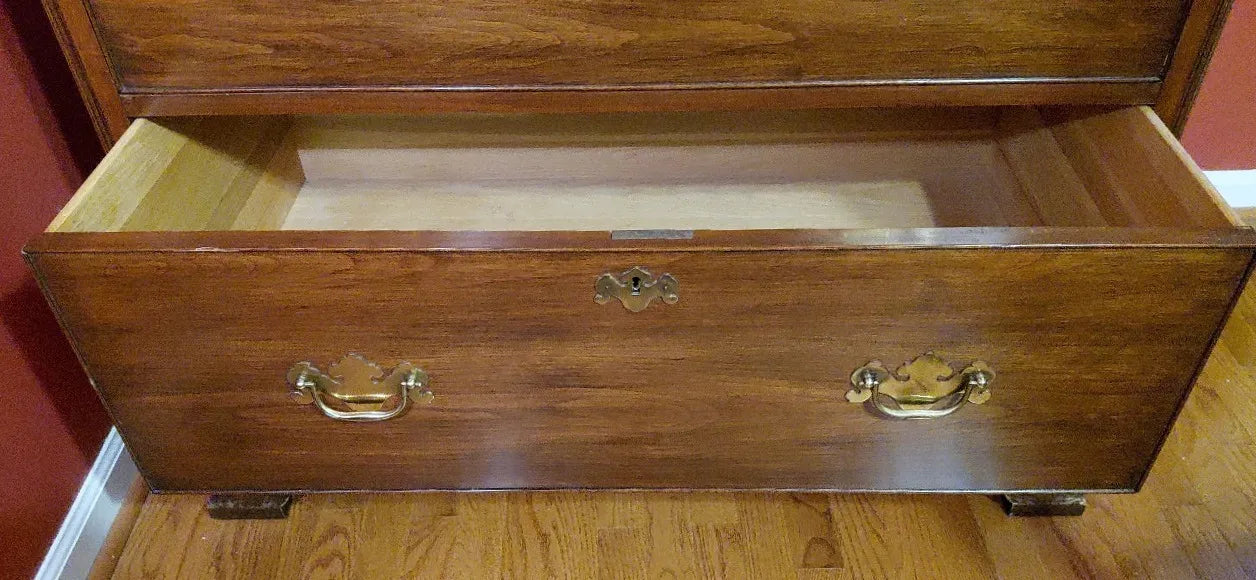 Ideal for a primary bedroom, formal guest suite, or distinguished dressing room, this New Market chest offers generous storage without sacrificing elegance. Its tall stature and classic drawer arrangement make it both practical and visually commanding, while the cherry finish pairs effortlessly with traditional, transitional, and curated historic interiors. As Henkel Harris production becomes increasingly scarce, pieces of this caliber are seldom found outside private estates.