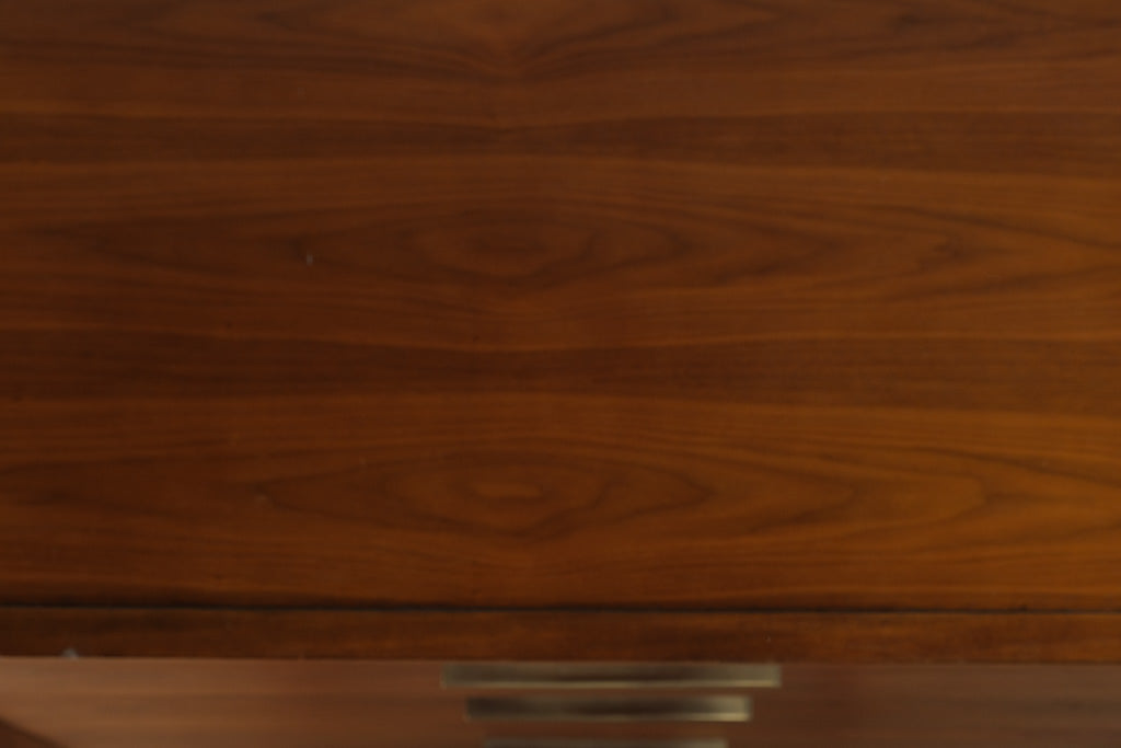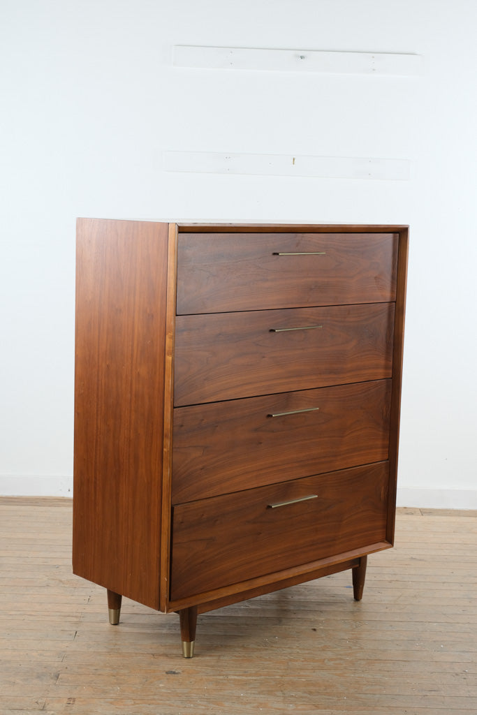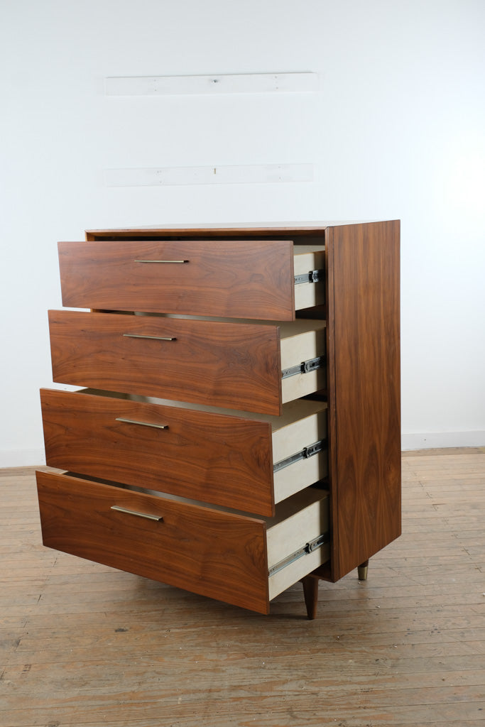 Mid century modern walnut 5 drawer chest in hardwood solids and walnut veneer with Marina Del Rey styling and clean architectural lines. Framed case construction with integrated drawer fronts and brushed brass pulls reflects classic American mid century proportions and hardware design. Craze Furniture presents this piece with soft close drawer glides, English dovetail joinery, and a cedar lined bottom drawer for functional longevity and material integrity.