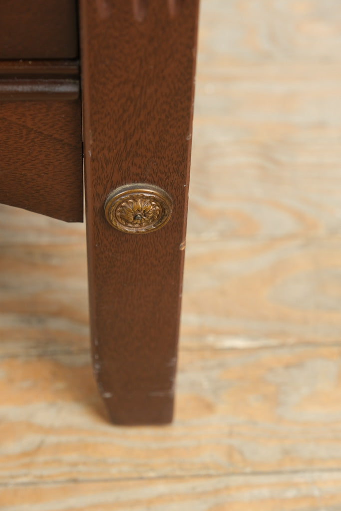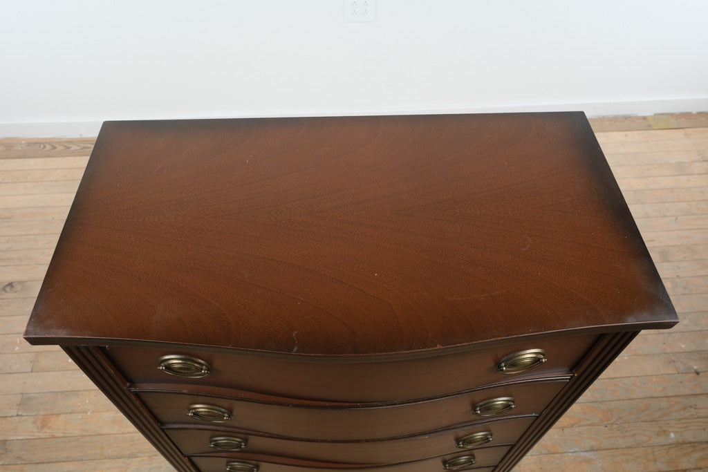Crafted in mahogany, this dresser features a graceful bow front profile and solid construction throughout. The drawers are dovetailed and built to last, sliding smoothly and evenly. Decorative brass pulls and subtle vertical fluting along the front edges add depth and classic detailing without feeling overly ornate.