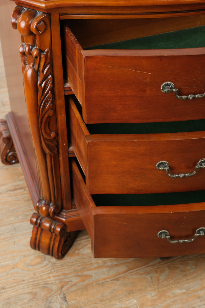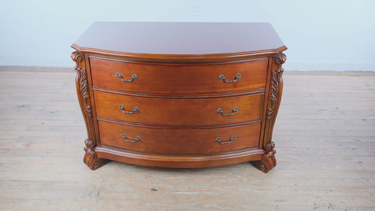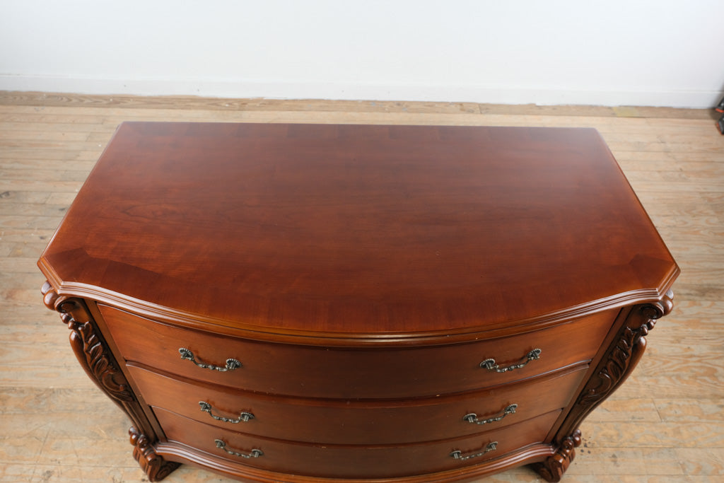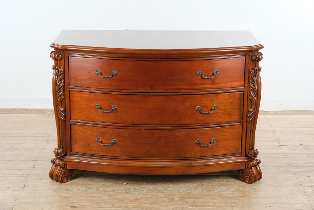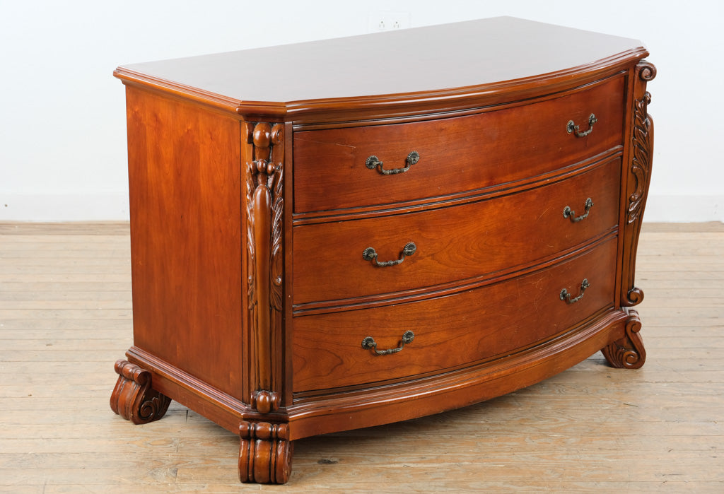 Solid cherry serpentine front dresser chest in traditional style with carved corner columns and bracket feet. Three wide drawers follow the curved case form, offering substantial horizontal storage with decorative depth. Craze Furniture presents a classic American design emphasizing formal proportions, carved embellishment, and enduring construction.