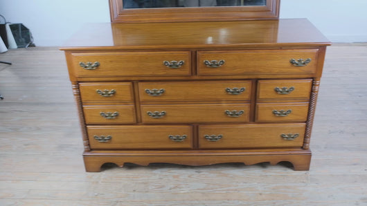 Anchored in classic craftsmanship and warm traditional styling, this United Furniture Corporation dresser offers a refined, substantial presence with its solid wood construction, spiraled column detailing, and beautifully framed matching mirror. Its balanced proportions and timeless finish make it a versatile addition to any bedroom.