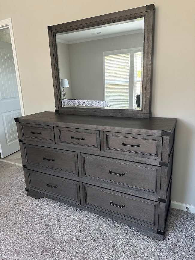 Refined storage meets enduring craftsmanship in the Vickery Creek seven drawer dresser, finished in a richly textured weathered gray with classic antique pewter hardware. Available through Craze Furniture, this substantial 63 inch dresser blends wire brushed oak character with tailored detailing and premium drawer construction for a sophisticated and highly functional bedroom anchor.
