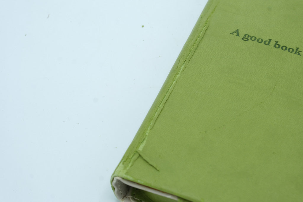 Original green folio case with embossed quote: “A good book is the best of friends”