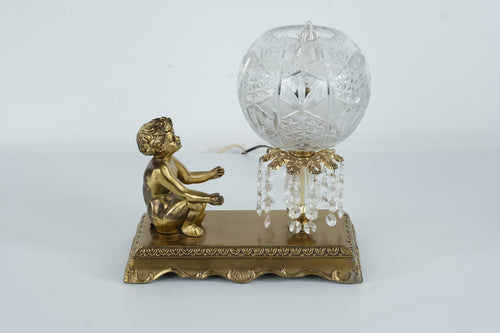 Vintage Hollywood Regency Cherub Lamp – Cut Glass Globe & Crystal Prisms – Works!