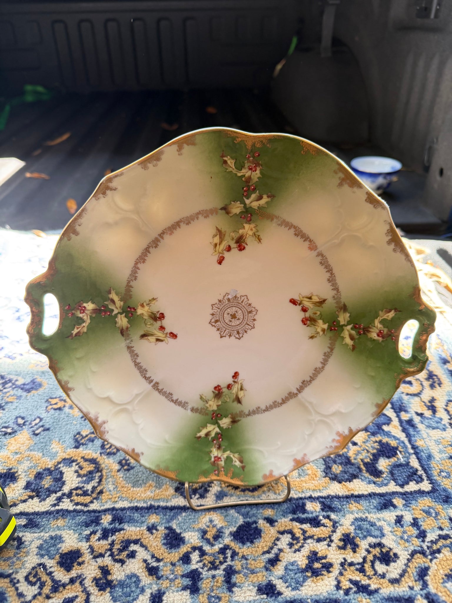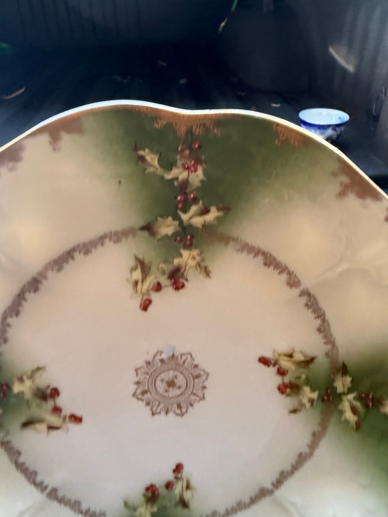 Infuse your holiday décor with old-world elegance through this antique Carl Tielsch & Co. handled serving plate, a fine example of early 20th-century German porcelain artistry. Featuring a graceful holly and red berry design, the plate’s green ombré fade and gold-gilded rim create a warm, festive charm perfect for display or entertaining.