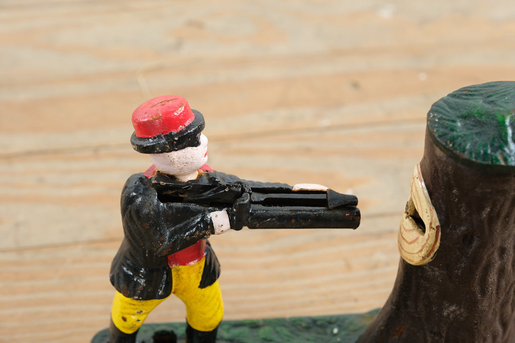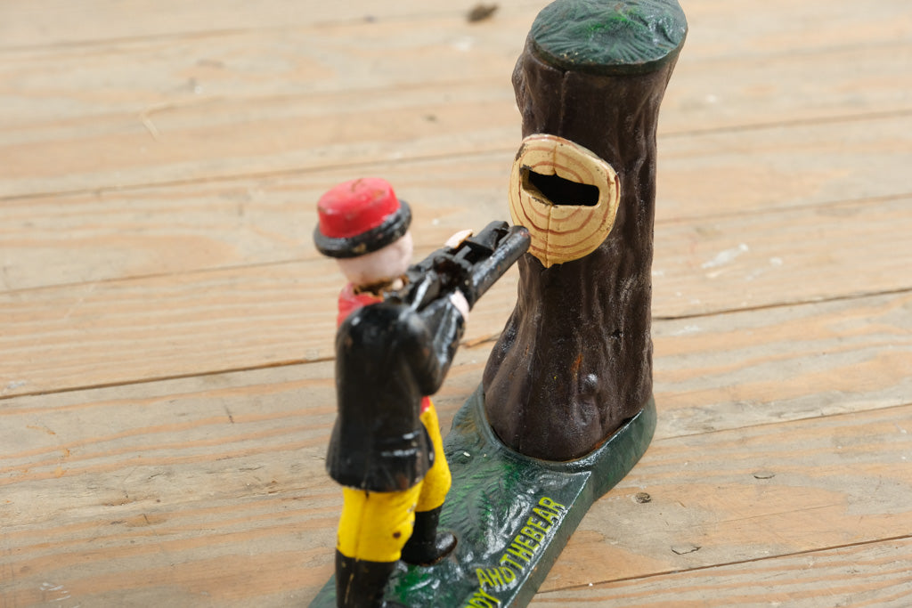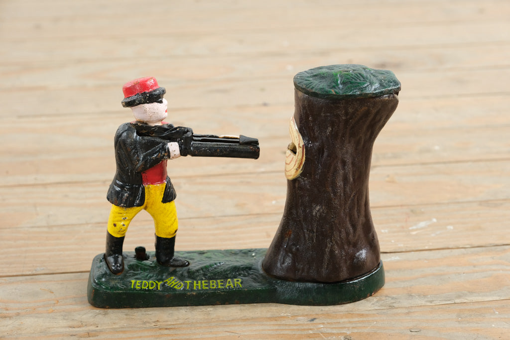 The mechanical action is both clever and entertaining: a coin is placed on the end of the rifle barrel, and when the lever located between Roosevelt’s feet is pressed, the coin is “shot” into a hole in the tree trunk as the bear’s head dramatically pops up from the top of the tree. This example works properly, with smooth action and strong visual impact.