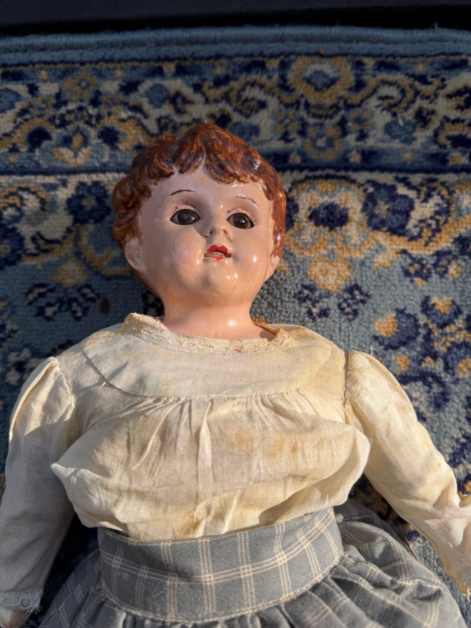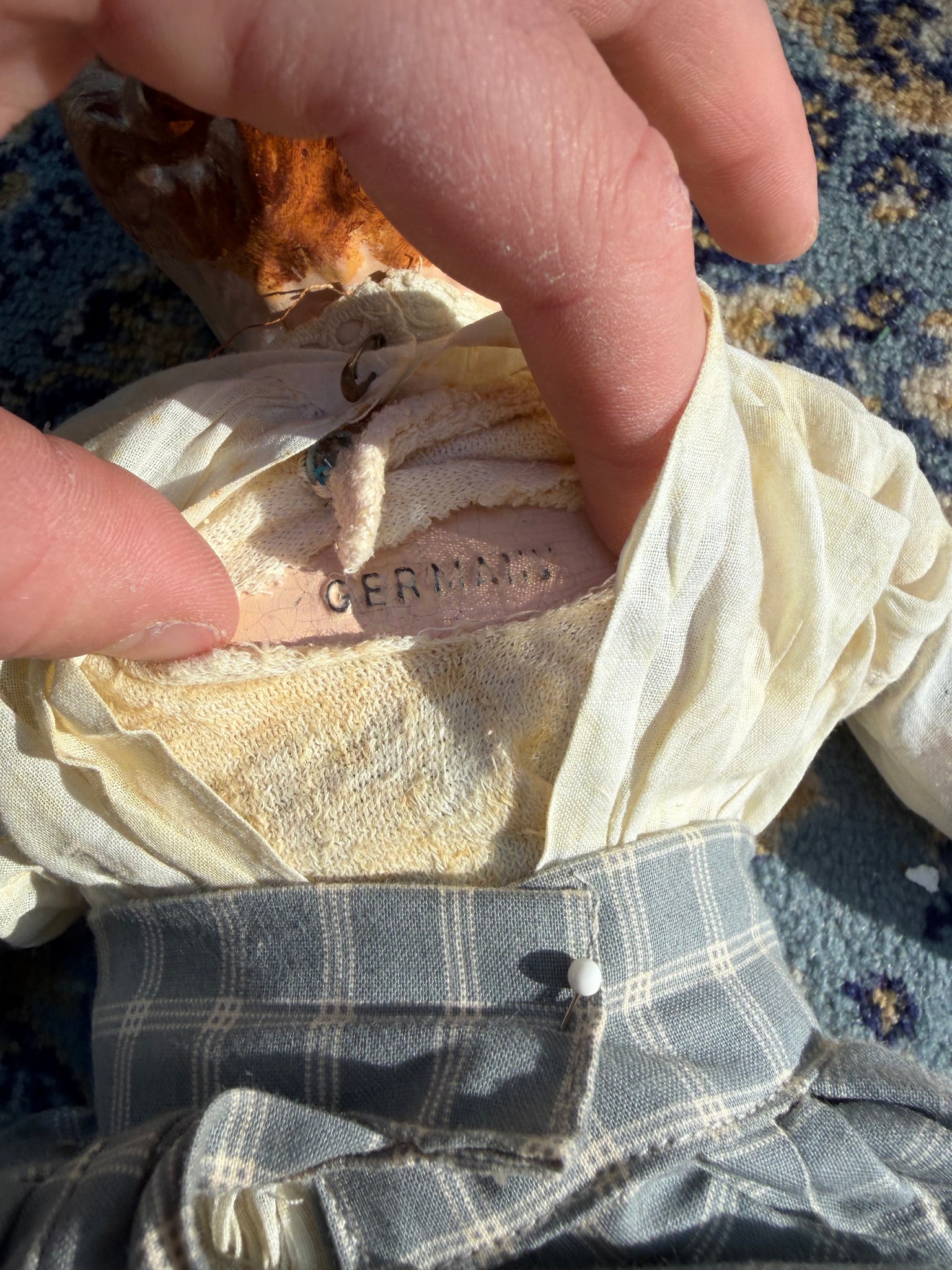 A beautiful piece of dollmaking history, this antique German composition doll features a hand-painted face, molded brown hair, and original period clothing. The doll has a serene expression, glass or painted eyes, and a cloth body with a composition head, lower arms, and legs typical of early 20th-century German craftsmanship. The back of the neck is marked “GERMANY”, confirming its origin.