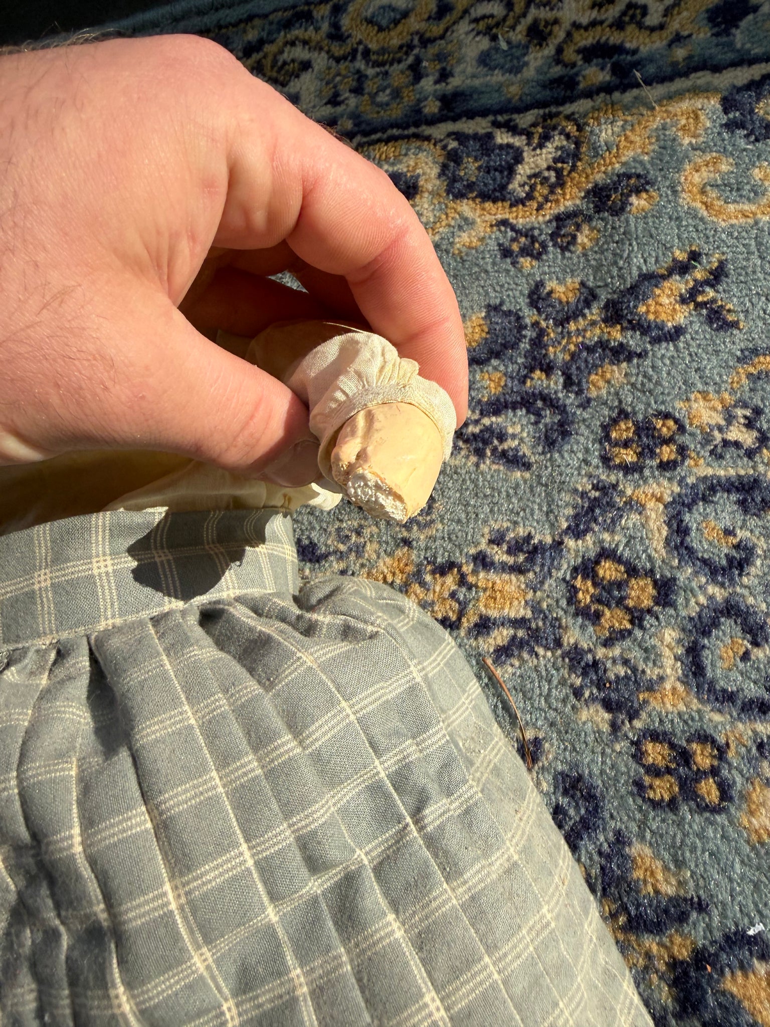The doll wears a cream blouse and gray plaid skirt with lace trim—likely original or period-appropriate handmade garments. Despite some age wear and missing hands, the doll retains remarkable charm and historical appeal.