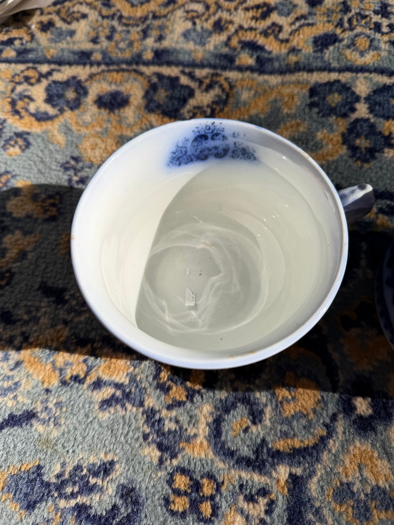 Each cup shows the rich, romantic fading of the blue transfer pattern against a creamy white body, with elegant handles and slightly flared rims—perfect examples of authentic flow blue artistry prized by collectors today.