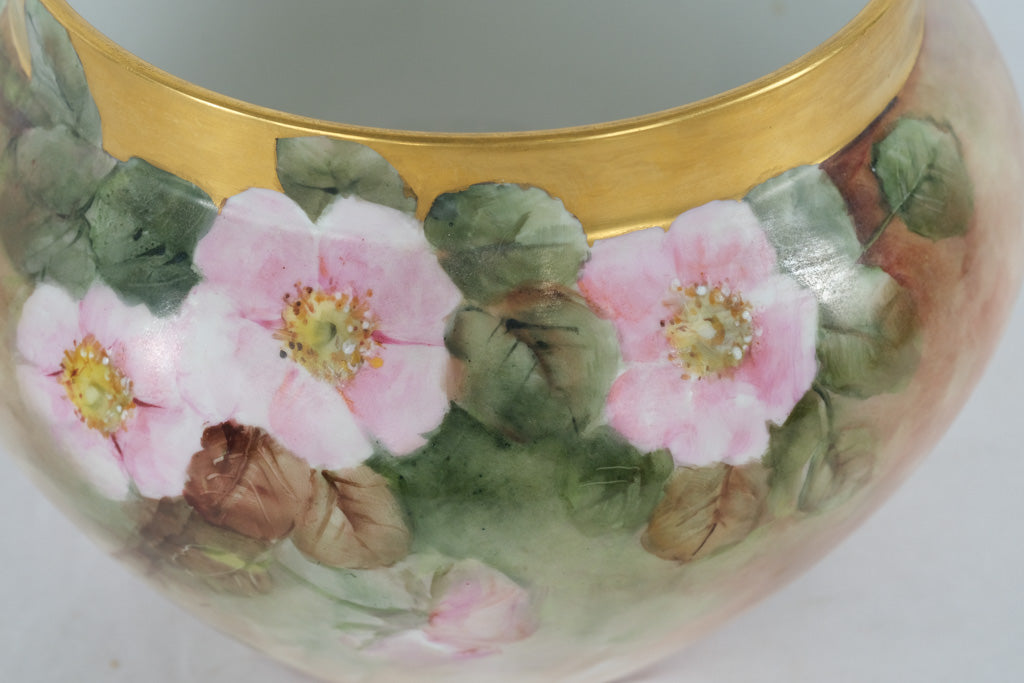 A stunning example of early 20th-century French porcelain artistry, this T&V Limoges hand-painted bowl features delicate pink wild roses with lush green foliage and a rich matte-to-gloss gradient background in warm earth tones. The wide 22K-style gold band along the rim adds refined elegance. Crafted by Tressemanes & Vogt, this Limoges piece exemplifies the quality and beauty of French hand-painted porcelain, perfect for collectors or display in a romantic or vintage-inspired setting.