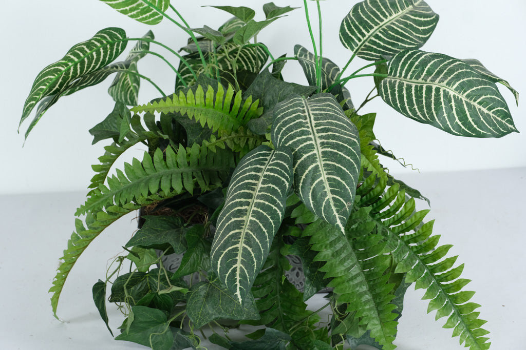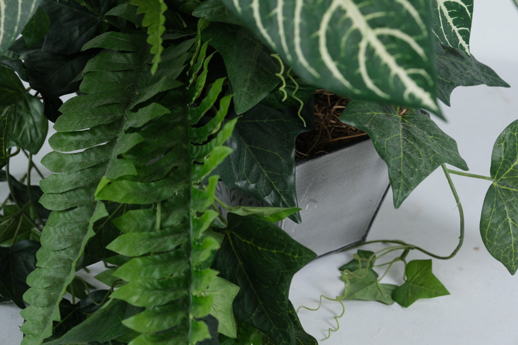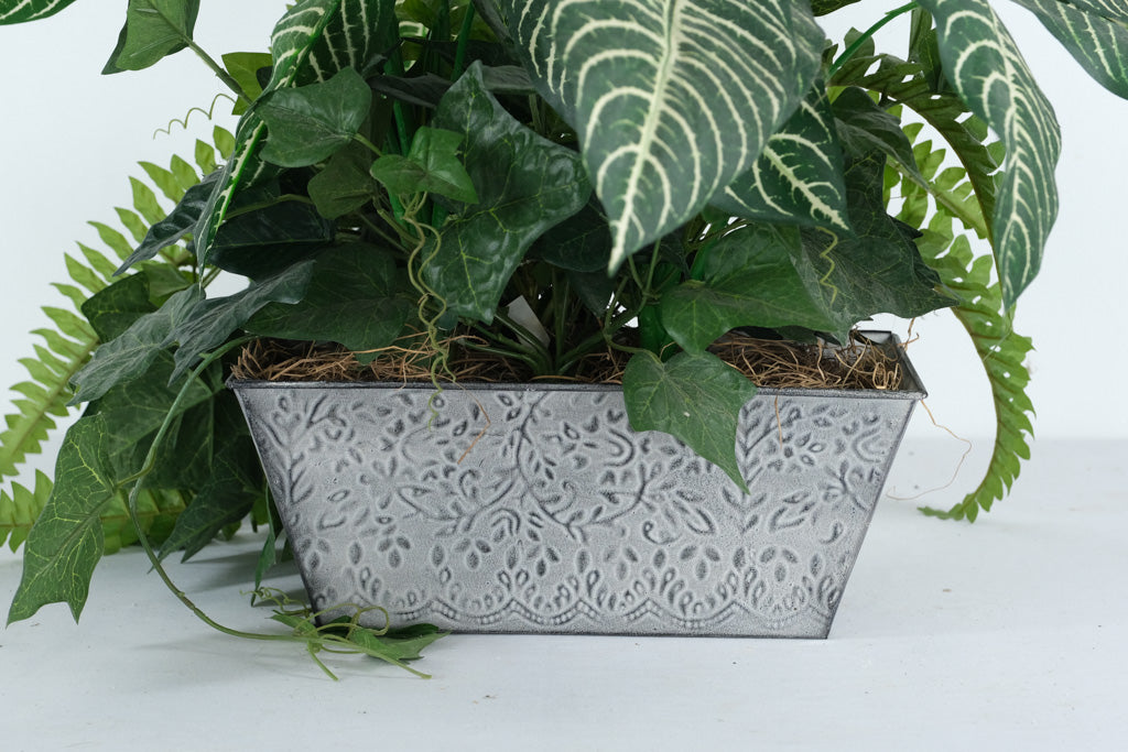 Add a touch of natural beauty to any room—without the upkeep—with this elegant artificial mixed greenery arrangement. Nestled in a 12” wide embossed metal planter, this lush display features a realistic combination of leafy ferns and variegated foliage for a full, vibrant look. The gray metal container showcases a vintage-inspired embossed pattern, giving it a timeless charm that complements farmhouse, industrial, and modern décor alike. Perfect for tabletops, consoles, or office spaces where fresh greenery isn’t practical.
